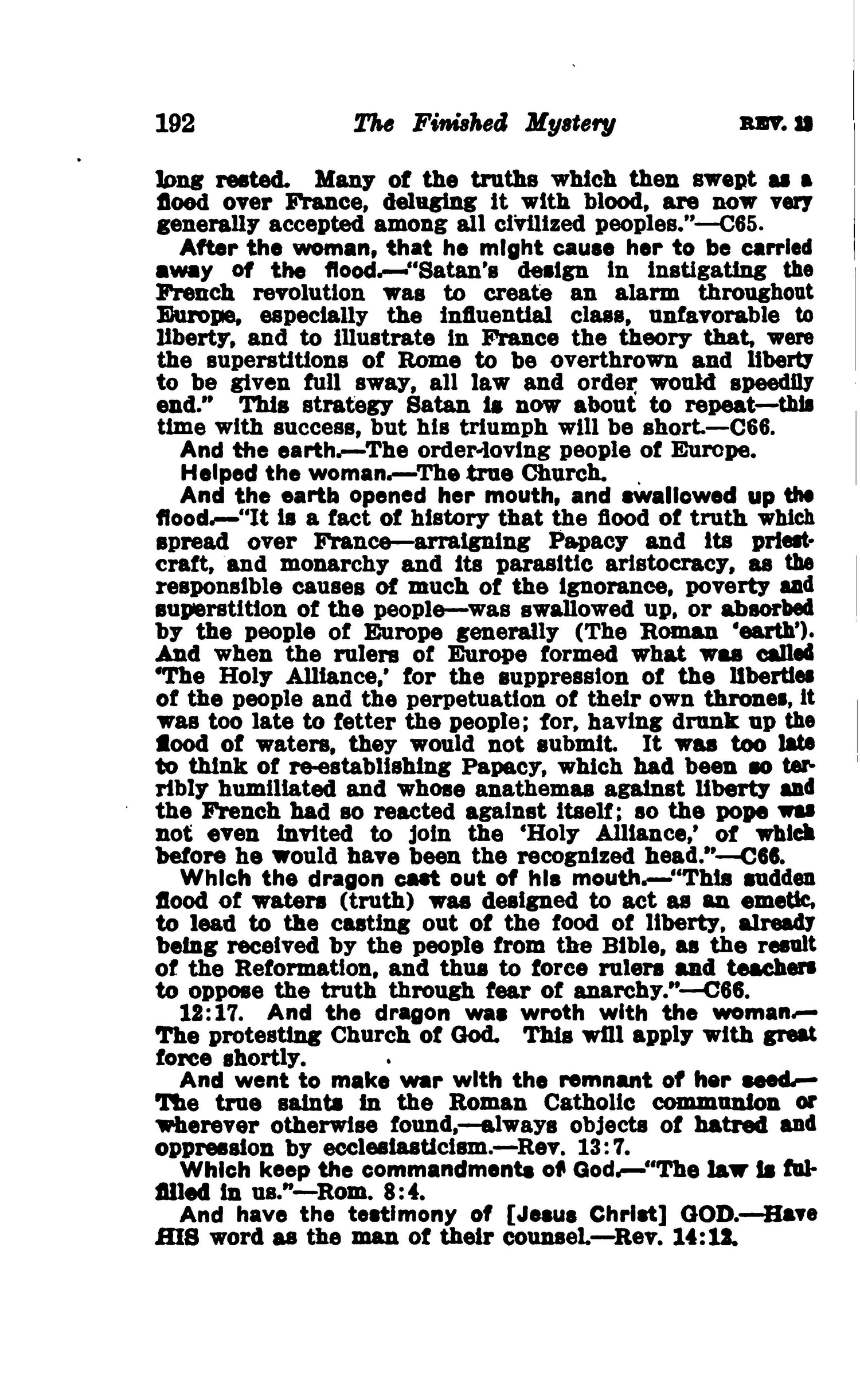 And the Serpent. — Satan himself, at the close of the 1260 years of Papacy's power to persecute. Cast out of his mouth water as a flood. — "The strength of the French revolution, to which reference is here bad, lay in the fact that it was instigated by many stern truths, regarding priest-craft and king-craft, and regarding the individual rights and liberties of all. Truths regarding human rights were seen and expressed there which cause us surprise when we consider the ignorance, superstition and servility of that day, under which the masses had so long rested. Many of the truths which then swept as a flood over France, deluging it with blood, are now very generally accepted among all civilized peoples."— C65. Source : 🇺🇸 1917 - Studies in the Scriptures, Vol 7, The finished mystery, page 191, page 192 + Cover |