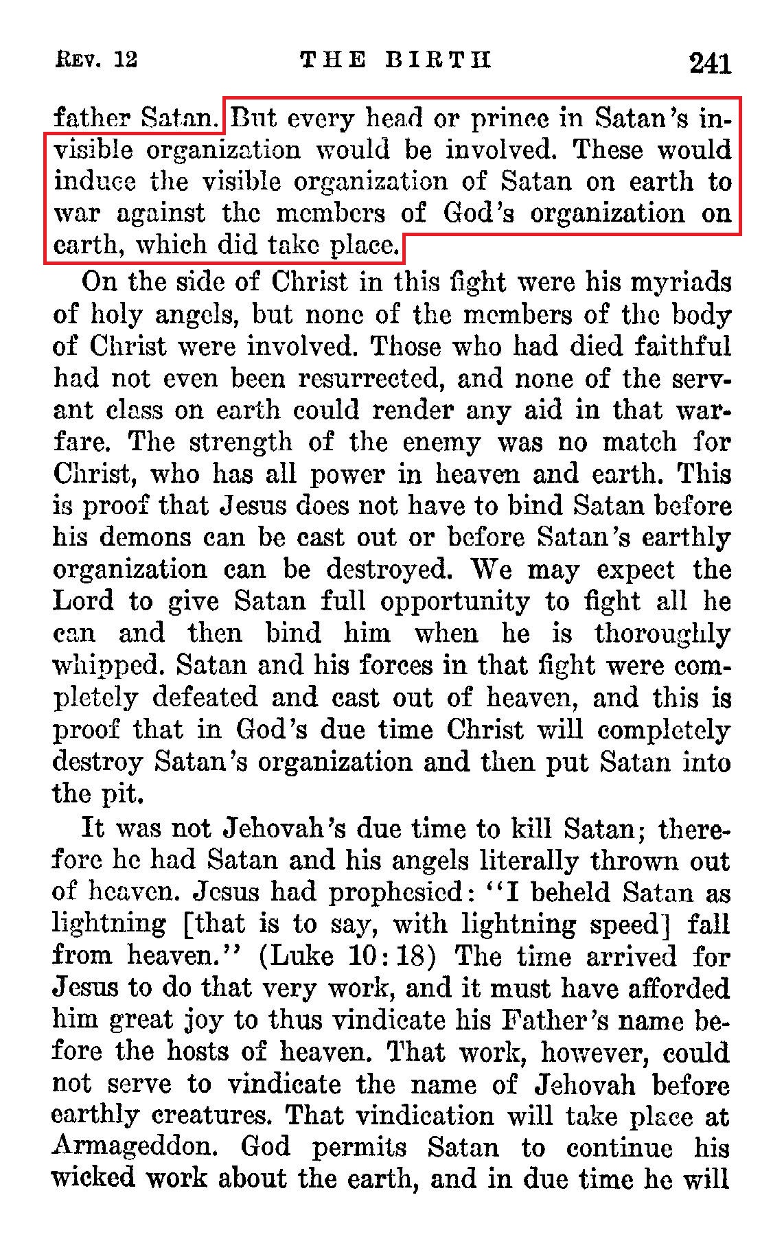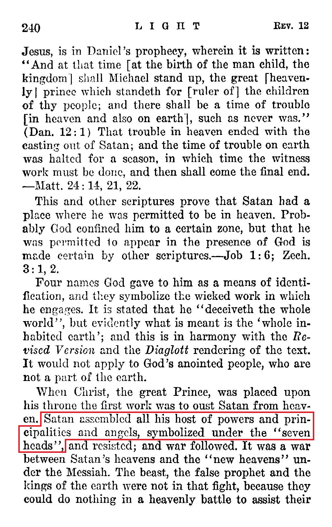 Satan assembled all his host of powers and principalities and angels, symbolized under the "seven heads", and resisted, and war followed. [...] But every head or prince in Satan's invisible organization would be involved. These would induce the visible organization of Satan on earth to war against the members of God's organization on earth, which did take place. Source : 🇺🇸 1930 - Light, Vol 1, page 240, page 241 + Cover |