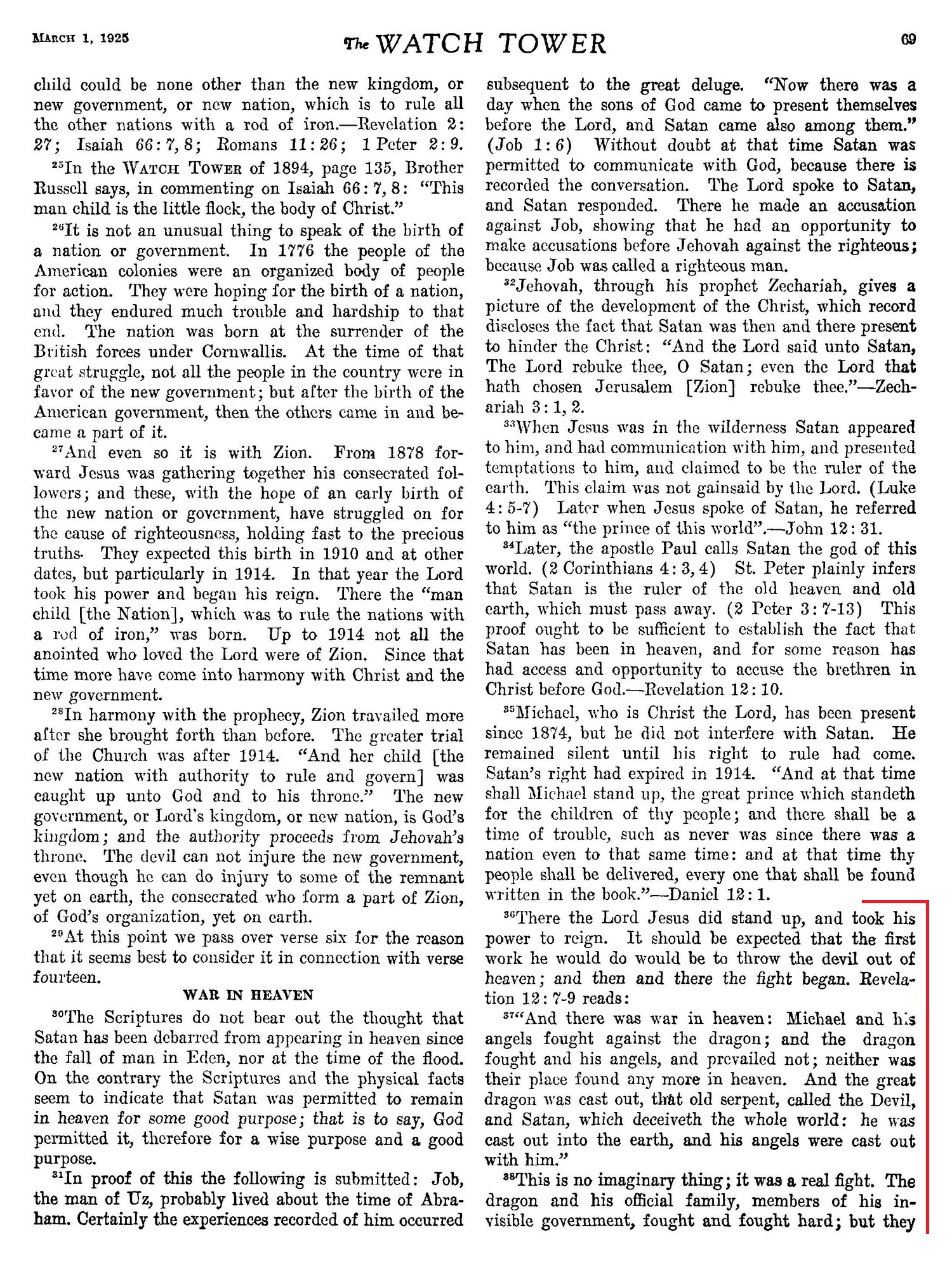 "And there was war in heaven: Michael and his angels fought against the dragon; and the dragon fought and his angels, and prevailed not; neither was their place found any more in heaven. And the great dragon was cast out, that old serpent, called the Devil, and Satan, which deceiveth the whole world: he was cast out into the earth, and his angels were cast out; with him." This is no imaginary thing; it was a real fight. The dragon and his official family, members of his invisible government, fought and fought hard; but they lost, and were literally hurled out of heaven. [See Weymonth’s translation.] It is inconsistent to think that Jesus, tile righteous One, would take his power to reign in heaven and permit the devil to remain there; and he did not. Both Satan and his angels, namely, his ocfficial family, his invisible joint-rulers, were hurled down to the earth. That fight must have begun in 1914. Source : 🇺🇸 The Watchtower, March 1 1925, page 69, page 70 |