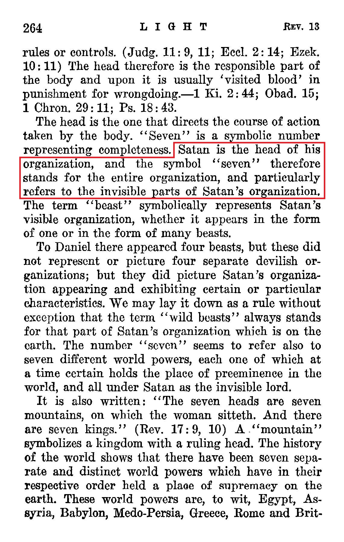 "The beast" John saw in vision had seven heads. [...] The head is the one that directs the course of action taken by the body. "Seven" is a symbolic number representing completeness. Satan is the head of his organization, and the symbol "seven" therefore stands for the entire organization, and particularly refers to the invisible parts of Satan's organization.
