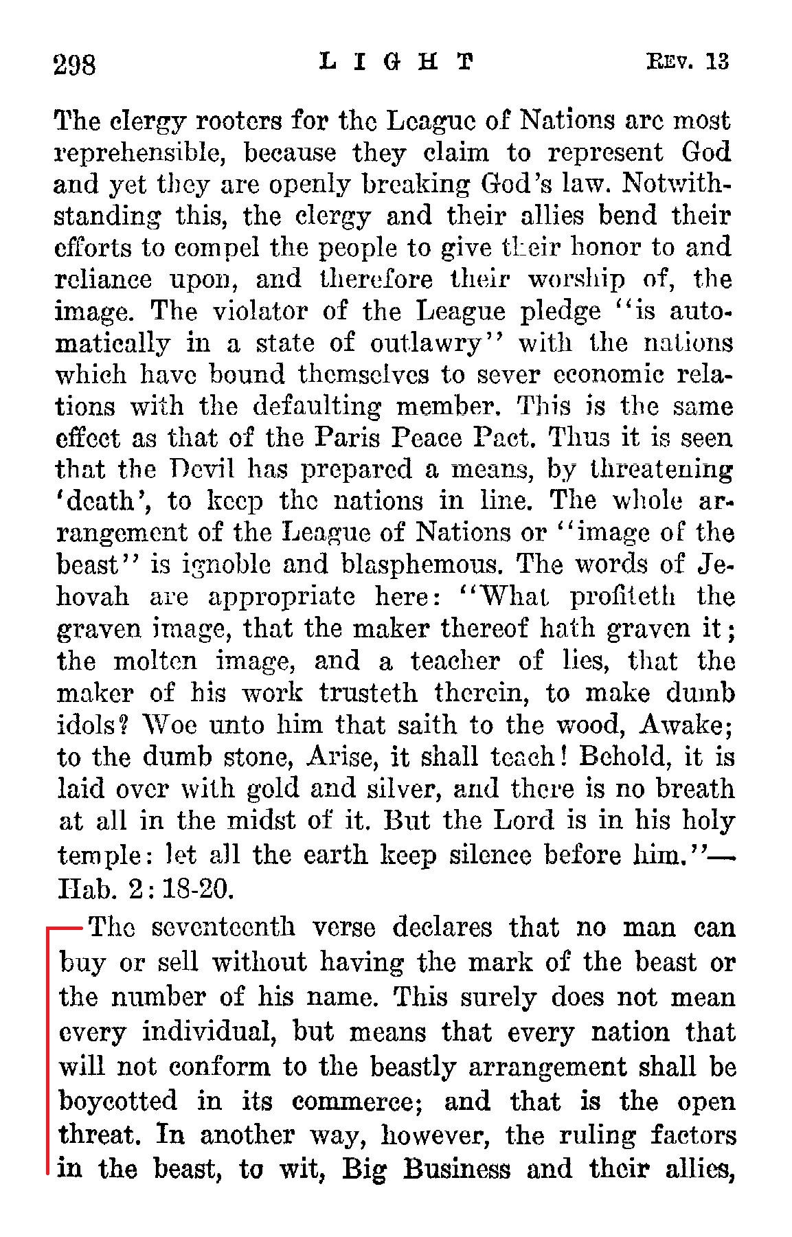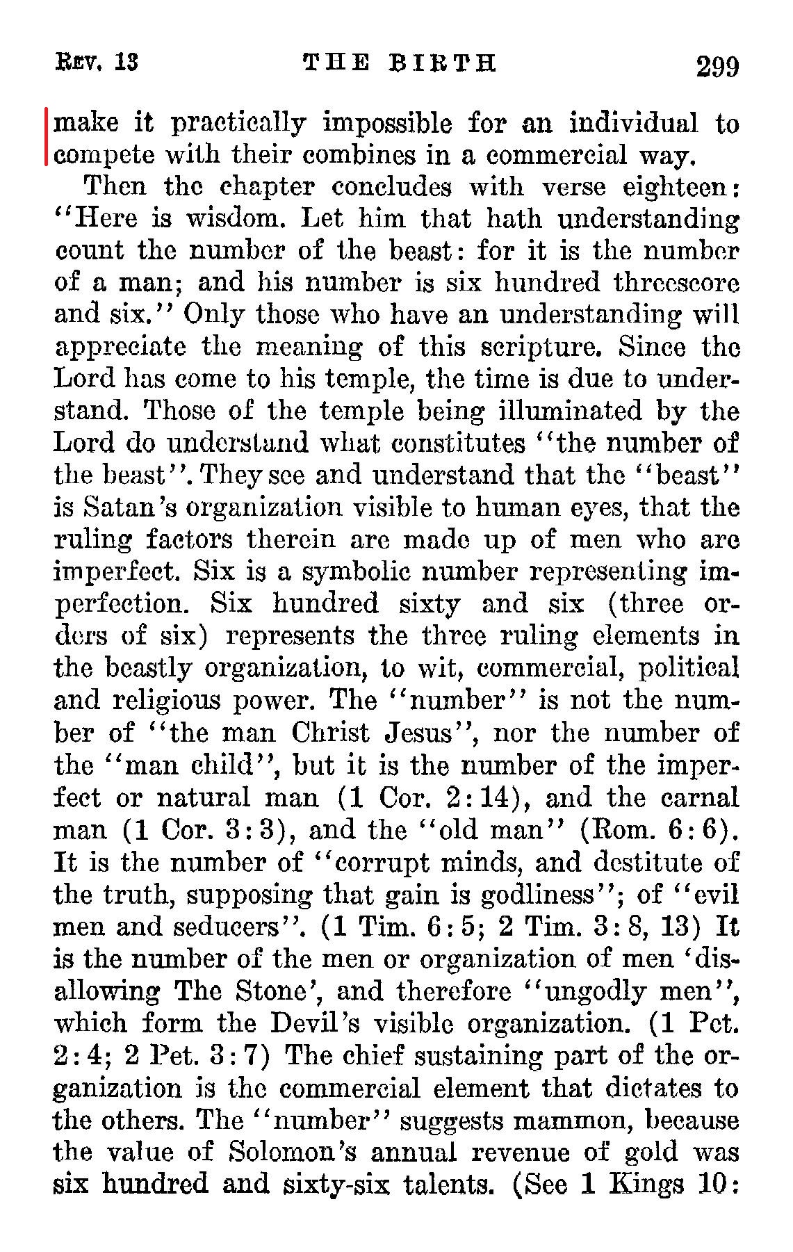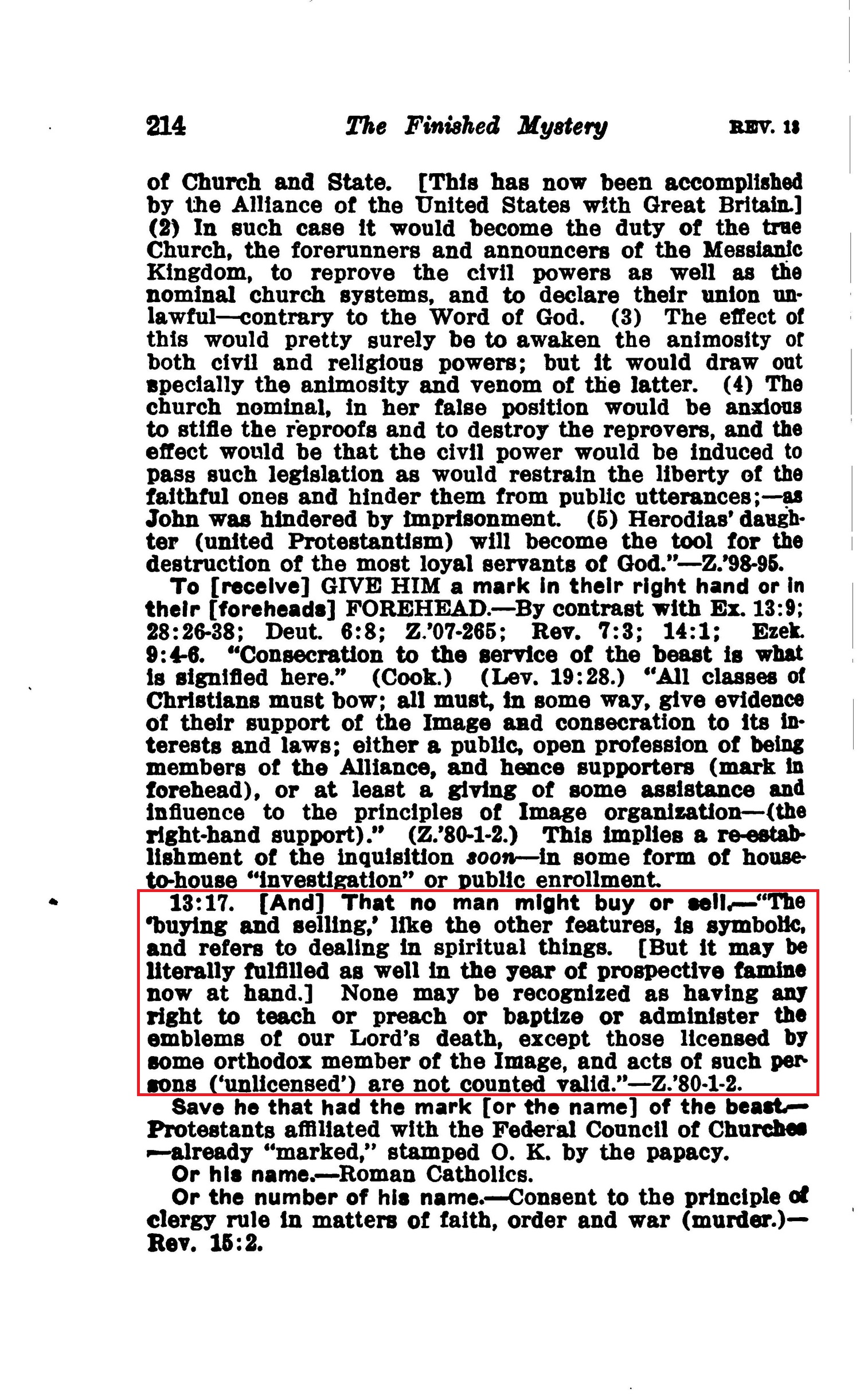 13:17. [And] That no man might buy or sell. — "The 'buying and selling,' like the other features, is symbolic, and refers to dealing in spiritual things. [But It may be literally fulfilled as well In the year of prospective famine now at hand.] None may be recognized as having any right to teach or preach or baptize or administer the emblems of our Lord's death, except those licensed by some orthodox member of the Image, and acts of such persons ('unlicensed') are not counted valid." — Z.'80-1-2. Source : 🇺🇸 1917 - Studies in the Scriptures, Vol 7, The finished mystery, page 214 + Cover |