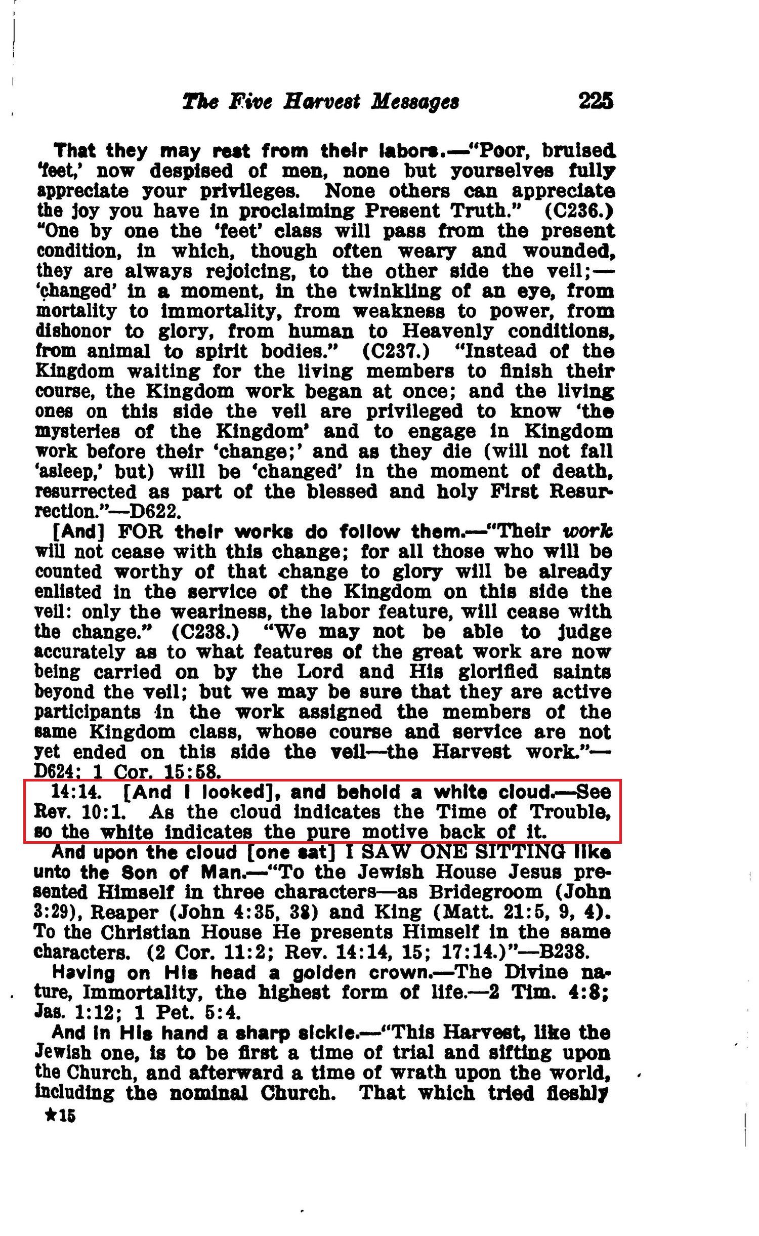 14:14. [And I looked], and behold a white cloud. — See Rev. 10:1. As the cloud indicates the Time of Trouble, so the white indicates the pure motive back of it. Source : 🇺🇸 1917 - Studies in the Scriptures, Vol 7, The finished mystery, page 225 + Cover |