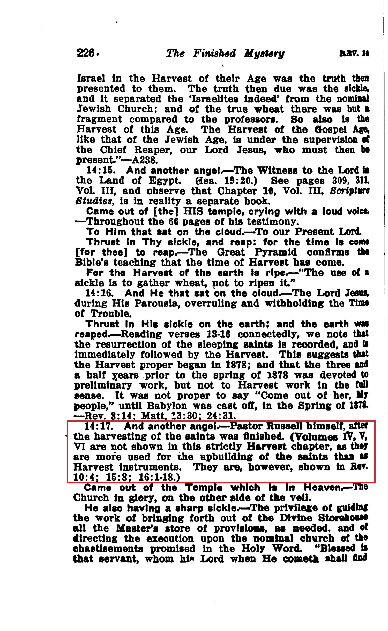 14:17. And another angel. — Pastor Russell himself, after the harvesting of the saints was finished. (Volumes IV, V, VI are not shown in this strictly Harvest chapter, as they are more used for the upbuilding of the saints than as Harvest instruments. They are, however, shown In Rev. 10:4; 15:8; 16:1-18.) Source : 🇺🇸 1917 - Studies in the Scriptures, Vol 7, The finished mystery, page 226 + Cover |