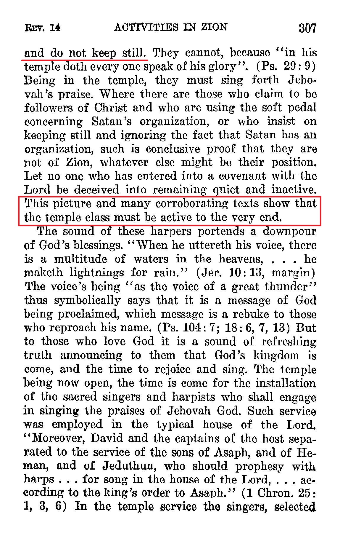 Therefore John, representing the servant class, hears "a voice from heaven, as the voice of many waters, and as the voice of a great thunder: and I heard the voice of harpers harping with their harps".- Vs. 2. The American Revised Version renders this, "the voice which I heard was as the voice of harpers." The picture shows that the members of Zion cannot and do not keep still. They cannot, because "in his temple doth everyone speak of his glory". (Ps. 29:9) Being in the temple, they must sing forth Jehovah's praise. Where there are those who claim to be followers of Christ and who are using the soft pedal concerning Satan's organization, or who insist on keeping still and ignoring the fact that Satan has an organization, such is conclusive proof that they are not of Zion, whatever else might be their position. Let no one who has entered into a covenant with the