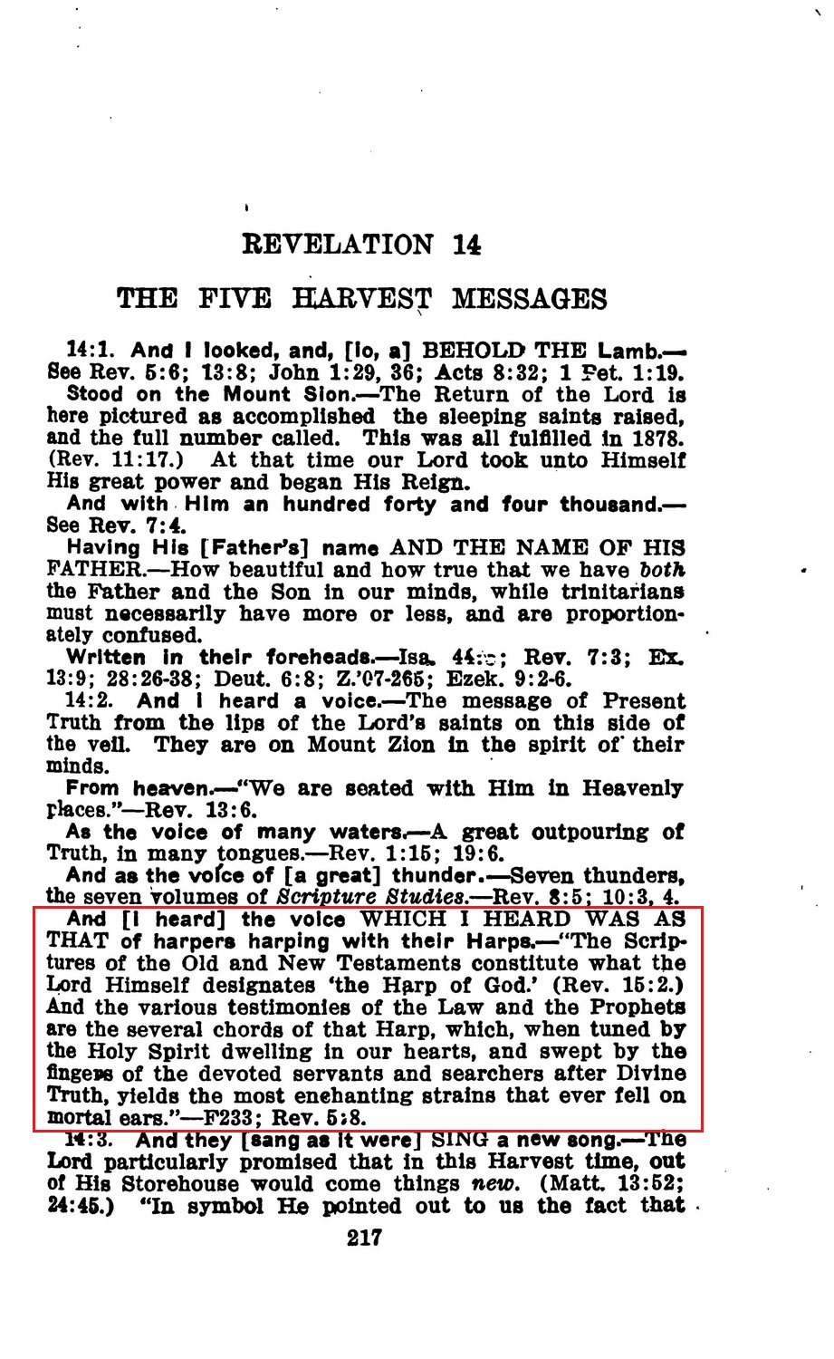 And [I heard] the voice WHICH I HEARD WAS AS THAT of harpers harping with their Harps. — "The Scriptures of the Old and New Testaments constitute what the Lord Himself designates 'the Harp of God.' (Rev. 15:2.) And the various testimonies of the Law and the Prophets are the several chords of that Harp, which, when tuned by the Holy Spirit dwelling in our hearts, and swept by the fingers of the devoted servants and searchers after Divine Truth, yields the most enchanting strains that ever fell on mortal ears."— F233; Rev. 5:8. Source : 🇺🇸 1917 - Studies in the Scriptures, Vol 7, The finished mystery, page 217 + Cover |