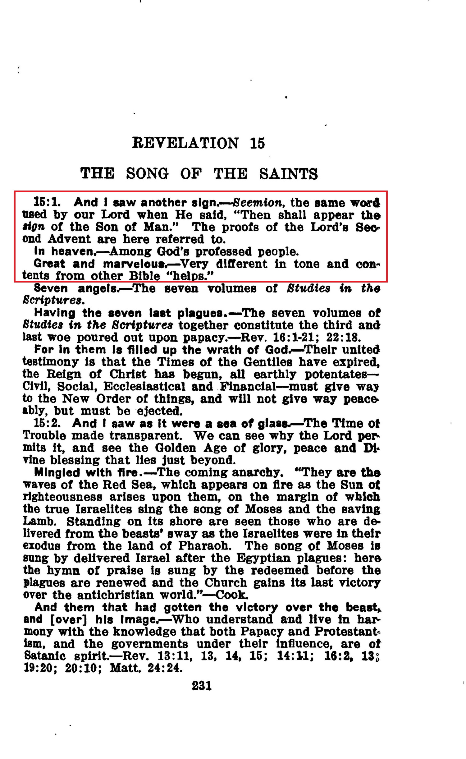 15:1. And I saw another sign. — Seemion, the same word used by our Lord when He said, "Then shall appear the sign of the Son of Man." The proofs of the Lord's Second Advent are here referred to. In heaven. — Among God's professed people. Great and marvelous. — Very different in tone and contents from other Bible "helps." Source : 🇺🇸 1917 - Studies in the Scriptures, Vol 7, The finished mystery, page 231 + Cover |