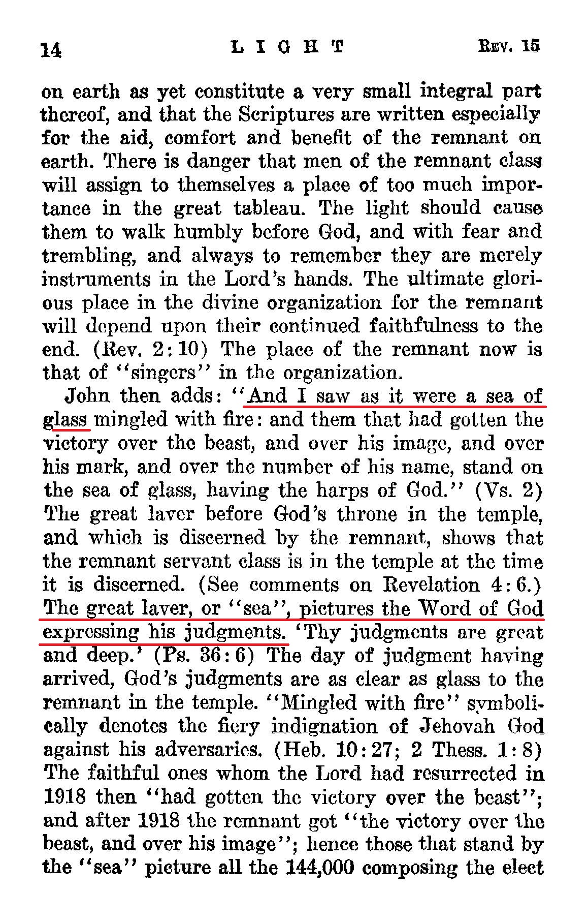 John then adds: "And I saw as it were a sea of glass mingled with fire: and them that had gotten the victory over the beast, and over his image, and over his mark, and over the number of his name, stand on the sea of glass, having the harps of God." (Vs. 2) The great laver before God's throne in the temple, and which is discerned by the remnant, shows that the remnant servant class is in the temple at the time it is discerned. (See comments on Revelation 4:6.) The great laver, or "sea", pictures the Word of God expressing his judgments. 'Thy judgments are great and deep.' (Ps, 36:6)