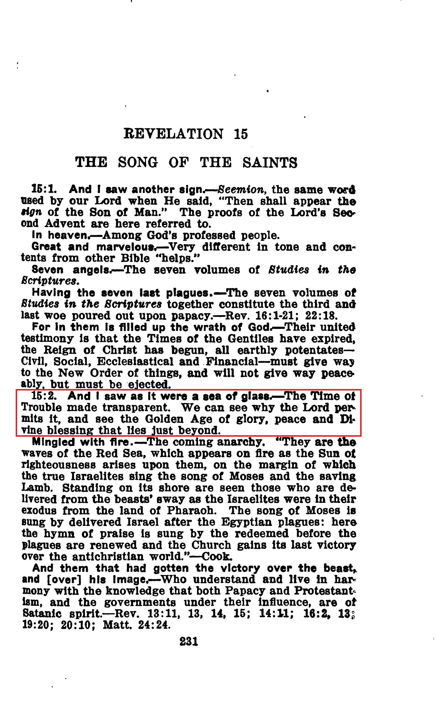 15:2. And I saw as It were a sea of glass. — The Time of Trouble made transparent. We can see why the Lord permits it, and see the Golden Age of glory, peace and Divine blessing that lies just beyond. Source : 🇺🇸 1917 - Studies in the Scriptures, Vol 7, The finished mystery, page 231 + Cover |