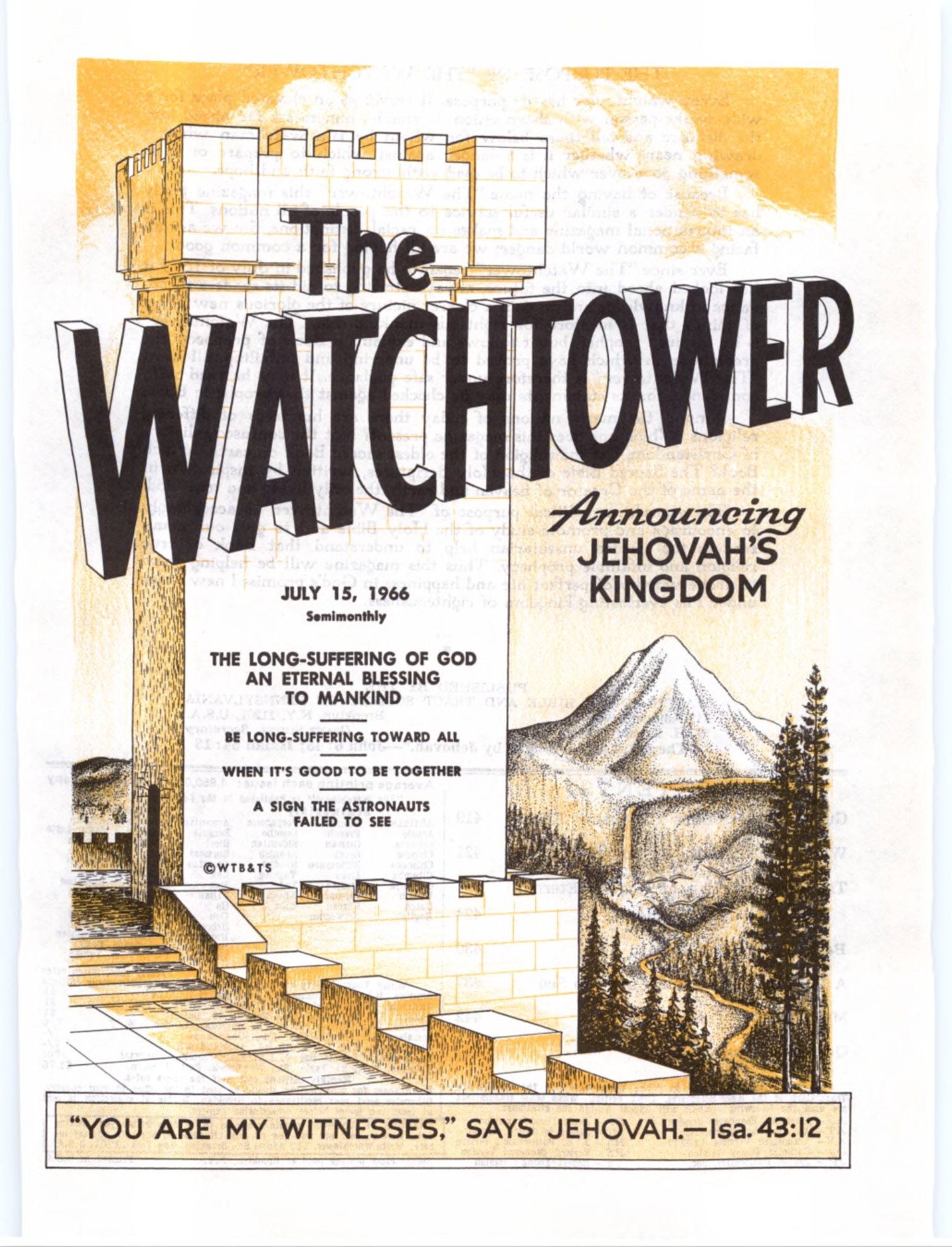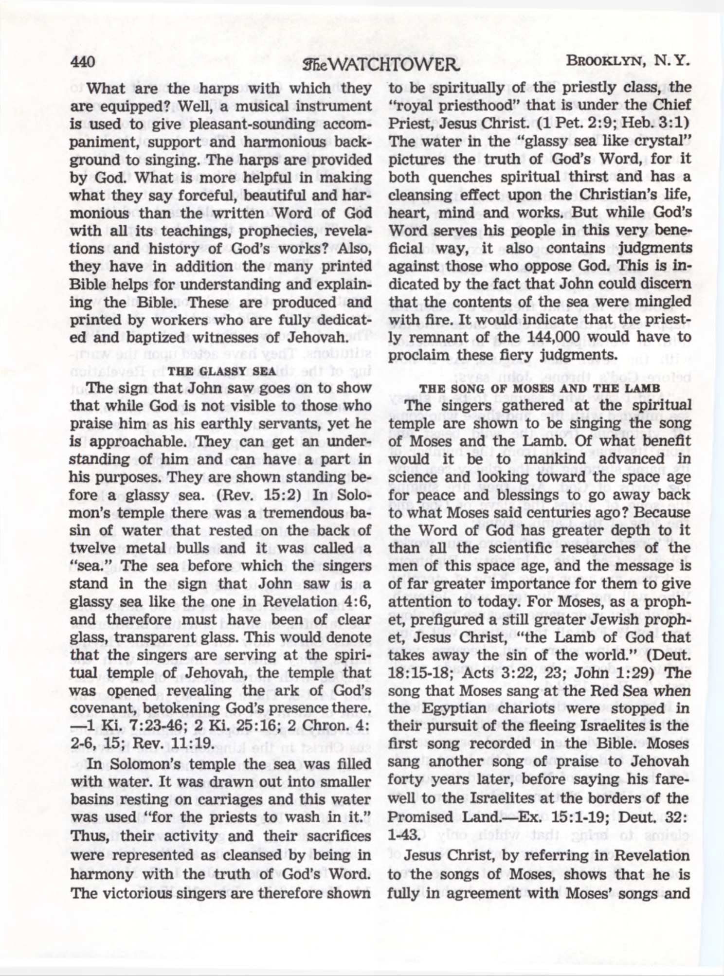 The sign that John saw goes on to show that while God is not visible to those who praise him as his earthly servants, yet he is approachable. They can get an understanding of him and can have a part in his purposes. They are shown standing before a glassy sea. (Rev. 15:2) [...] The water in the “glassy sea like crystal” pictures the truth of God’s Word, for it both quenches spiritual thirst and has a cleansing effect upon the Christian’s life, heart, mind and works. Source : 🇺🇸 1966 - The Watchtower, July 15 1966, page 440 + Cover |