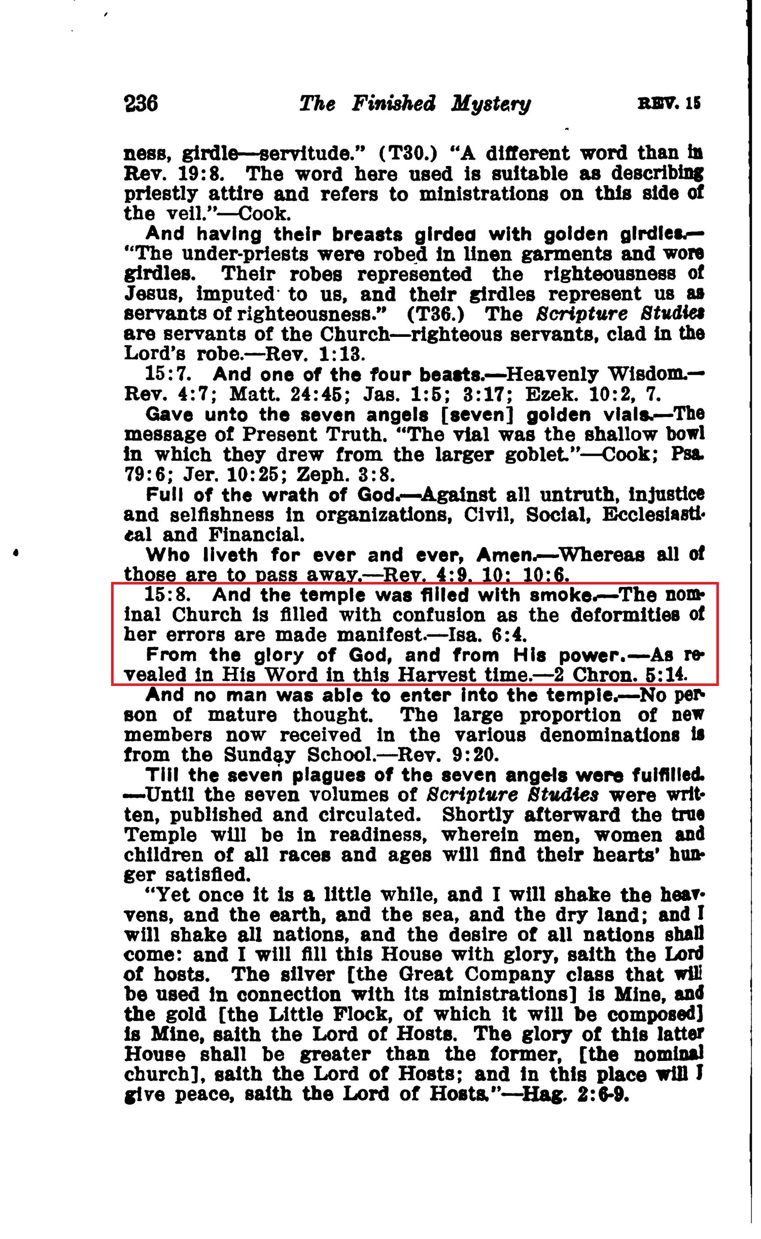 15:8. And the temple was filled with smoke. — The nominal Church is filled with confusion as the deformities of her errors are made manifest. — Isa. 6:4. Source : 🇺🇸 1917 - Studies in the Scriptures, Vol 7, The finished mystery, page 236 + Cover |