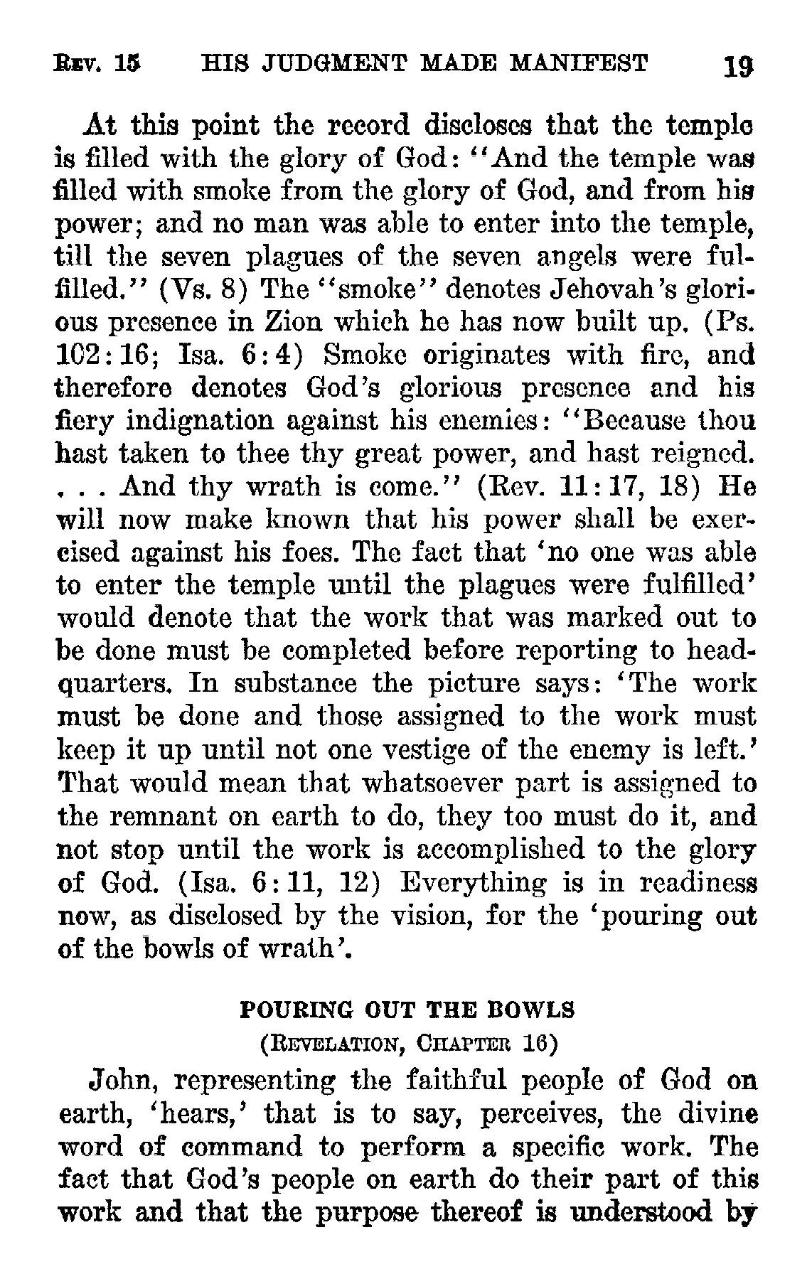 and no man was able to enter into the temple, till the seven plagues of the seven angels were fulfilled." (Vs. 8) [...] The fact that 'no one was able to enter the temple until the plagues were fulfilled' would denote that the work that was marked out to be done must be completed before reporting to headquarters. In substance the picture says: 'The work must be done and those assigned to the work must keep it up until not one vestige of the enemy is left.' That would mean that whatsoever part is assigned to the remnant on earth to do, they too must do it, and not stop until the work is accomplished to the glory of God. (Isa, 6:11, 12) Source : 🇺🇸 1930 - Light, Vol 2, page 19 + Cover |