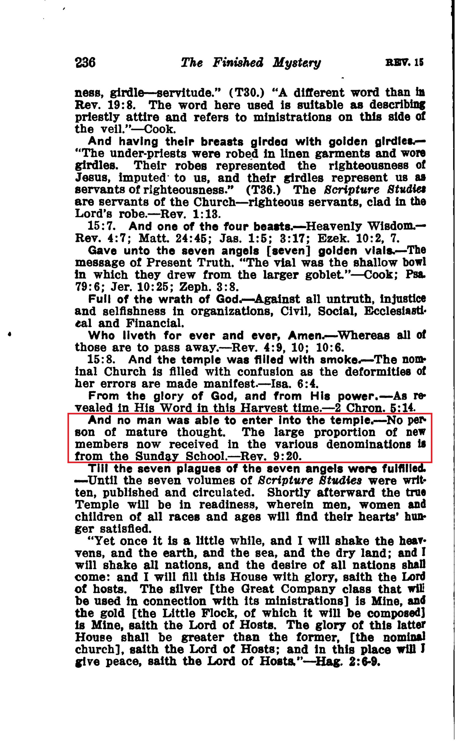 And no man was able to enter Into the temple, — No person of mature thought. The large proportion of new members now received in the various denominations is from the Sunday School.— Rev. 9:20. Till the seven plagues of the seven angels were fulfilled. — Until the seven volumes of Scripture Studies were written, published and circulated. Shortly afterward the true Temple will be in readiness, wherein men, women and children of all races and ages will find their hearts' hunger satisfied. Source : 🇺🇸 1917 - Studies in the Scriptures, Vol 7, The finished mystery, page 236 + Cover |