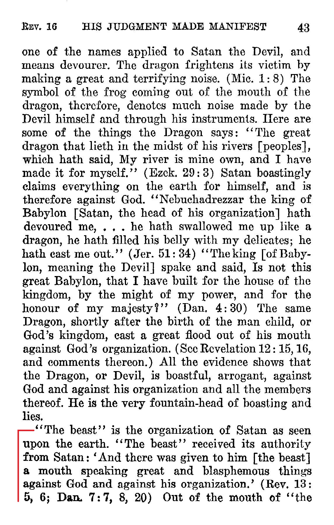 "The beast" is the organization of Satan as seen upon the earth. "The beast" received its authority from Satan: 'And there was given to him [the beast] a mouth speaking great and blasphemous things against God and against his organization.' (Rev. 13: 5, 6; Dan. 7:7, 8, 20) Out of the mouth of "the beast" comes an unclean spirit like a "marsh leaper" or "frog ", and is boastful, and is against God and against the people of Jehovah. "The beast" is the instrument that executes the will of its father the Devil on earth. The "beast" is anti-God and antiChrist and anti-kingdom, and boasts of owning and controlling the earth. In effect it says: 'Man for the earth, and the earth for man, and we own it.' It includes all the ruling factors of the earth, acting together as Satan's instrument. Source : 🇺🇸 1930 - Light, Vol 2, page 43, page 44 + Cover |