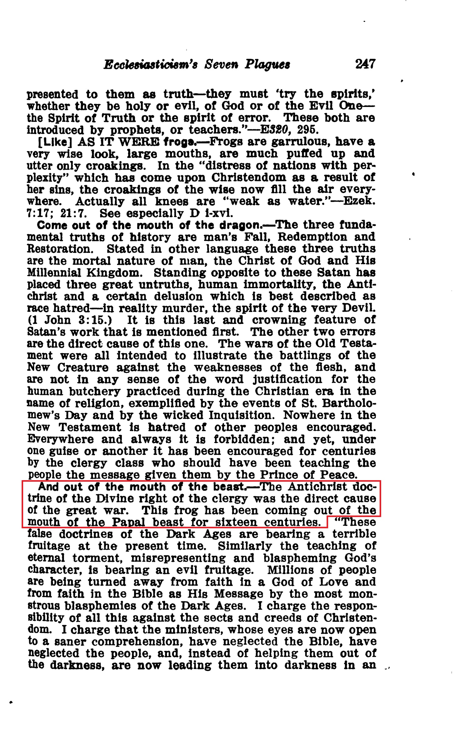 And out of the mouth of the beast. — The Antichrist doctrine of the Divine right of the clergy was the direct cause of the great war. This frog has been coming out of the mouth of the Papal beast for sixteen centuries. Source : 🇺🇸 1917 - Studies in the Scriptures, Vol 7, The finished mystery, page 247 + Cover |
