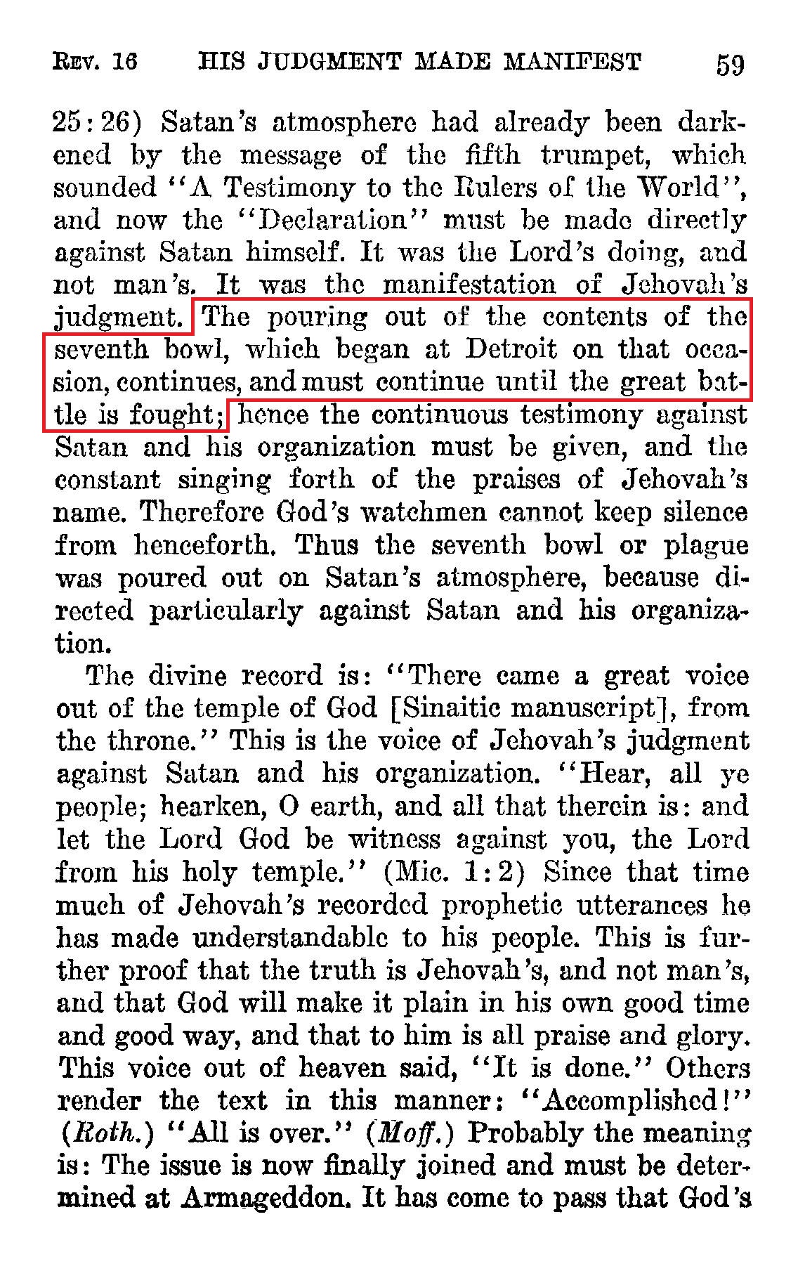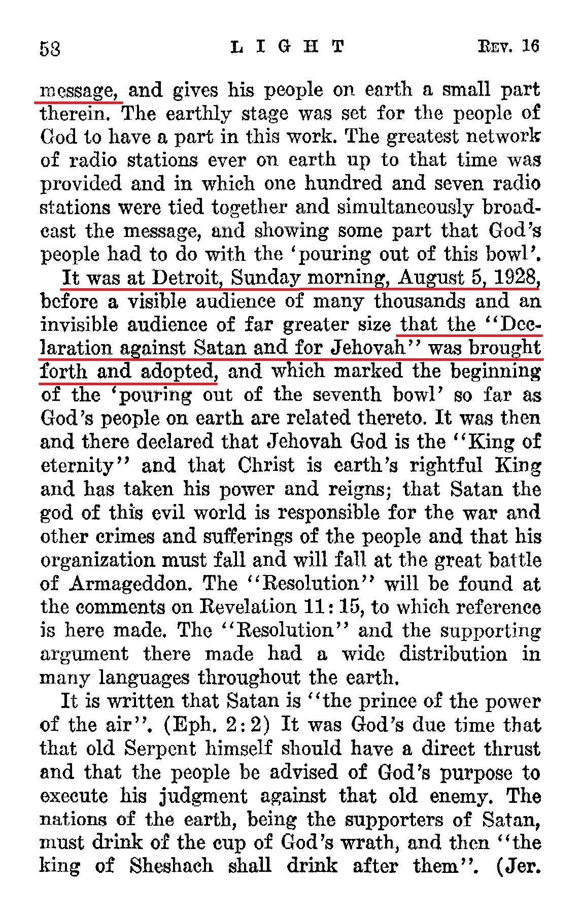 "And the seventh poured out his bowl on the air; and there came forth a loud voice from the temple of heaven, from the throne, saying, It is done." (Vs. 17, Diag.) The time had come for a declaration against Satan and for Jehovah, that the people might have an opportunity of learning of God's written judgments against Satan's organization and a chance to flee from that wicked organization. The Lord by his angel caused the preparation and proclamation of the message, and gives his people on earth a small part therein. The earthly stage was set for the people of God to have a part in this work. The greatest network of radio stations ever on earth up to that time was provided and in which one hundred and seven radio stations were tied together and simultaneously broadcast the message, and showing some part that God's people had to do with the 'pouring out of this bowl'. It was at Detroit, Sunday morning, August 5, 1928, before a visible audience of many thousands and an invisible audience of far greater size that the "Declaration against Satan and for Jehovah" was brought forth and adopted, and which marked the beginning of the 'pouring out of the seventh bowl' so far as God's people on earth are related thereto. [...] and now the "Declaration" must be made directly against Satan himself. It was the Lord's doing, and not man's. It was the manifestation of Jehovah's judgment. The pouring out of the contents of the seventh bowl, which began at Detroit on that occasion, continues, and must continue until the great battle is fought; Source : 🇺🇸 1930 - Light, Vol 2, page 57, page 58, page 59 + Cover |