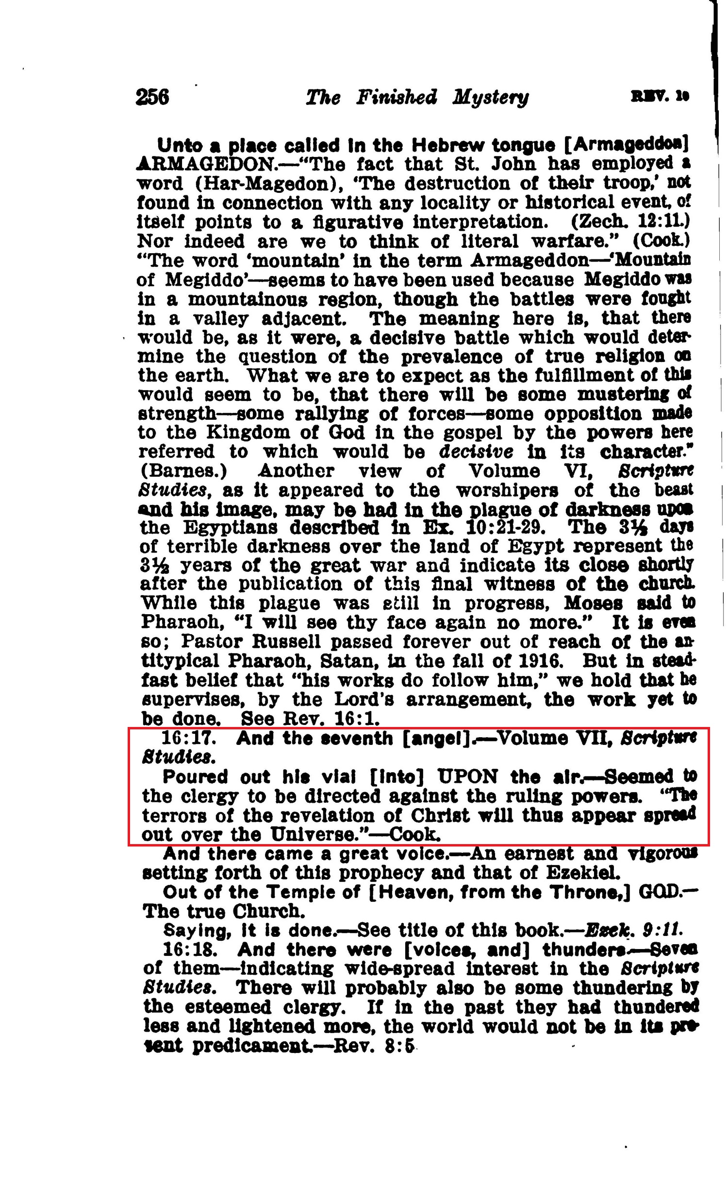 16:17. And the seventh [angel]. — Volume VII, Scripture Studies. Poured out his vial [Into] UPON the air - Seemed to the clergy to be directed against the ruling powers. "The terrors of the revelation of Christ will thus appear spread out over the Universe."—Cook. Source : 🇺🇸 1917 - Studies in the Scriptures, Vol 7, The finished mystery, page 256 + Cover |