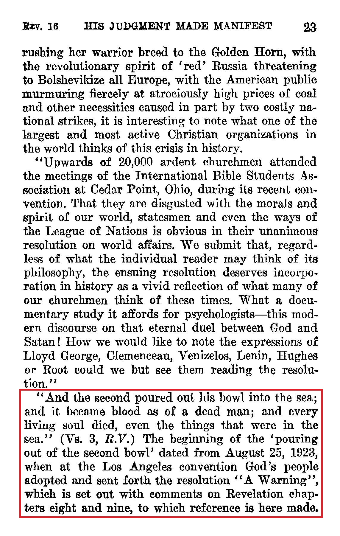 "And the second poured out his bowl into the sea; and it became blood as of a dead man; and every living soul died, even the things that were in the sea." (Vs. 3, R.V.) The beginning of the 'pouring out of the second bowl' dated from August 25, 1923, when at the Los Angeles convention God's people adopted and sent forth the resolution "A Warning", which is set out with comments on Revelation chapters eight and nine, to which reference is here made. Source : 🇺🇸 1930 - Light, Vol 2, page 23 + Cover |