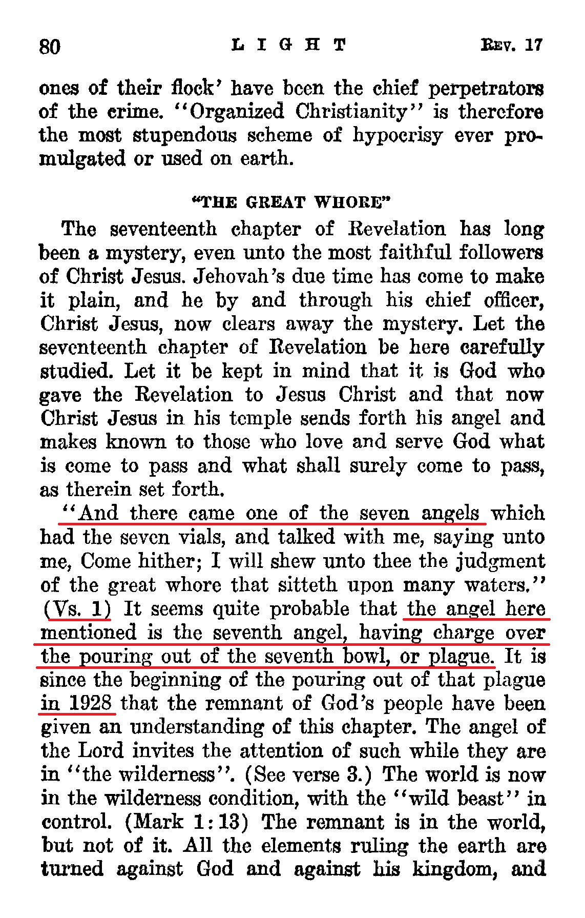 ""And there came one of the seven angels which had the seven vials, and talked with me, saying unto me, Come hither; I will shew unto thee the judgment of the great whore that sitteth upon many waters." (Vs, 1) It seems quite probable that the angel here mentioned is the seventh angel, having charge over the pouring out of the seventh bowl, or plague. It is since the beginning of the pouring out of that plague in 1928 that the remnant of God's people have been given an understanding of this chapter. Source : 🇺🇸 1930 - Light, Vol 2, page 80 + Cover |