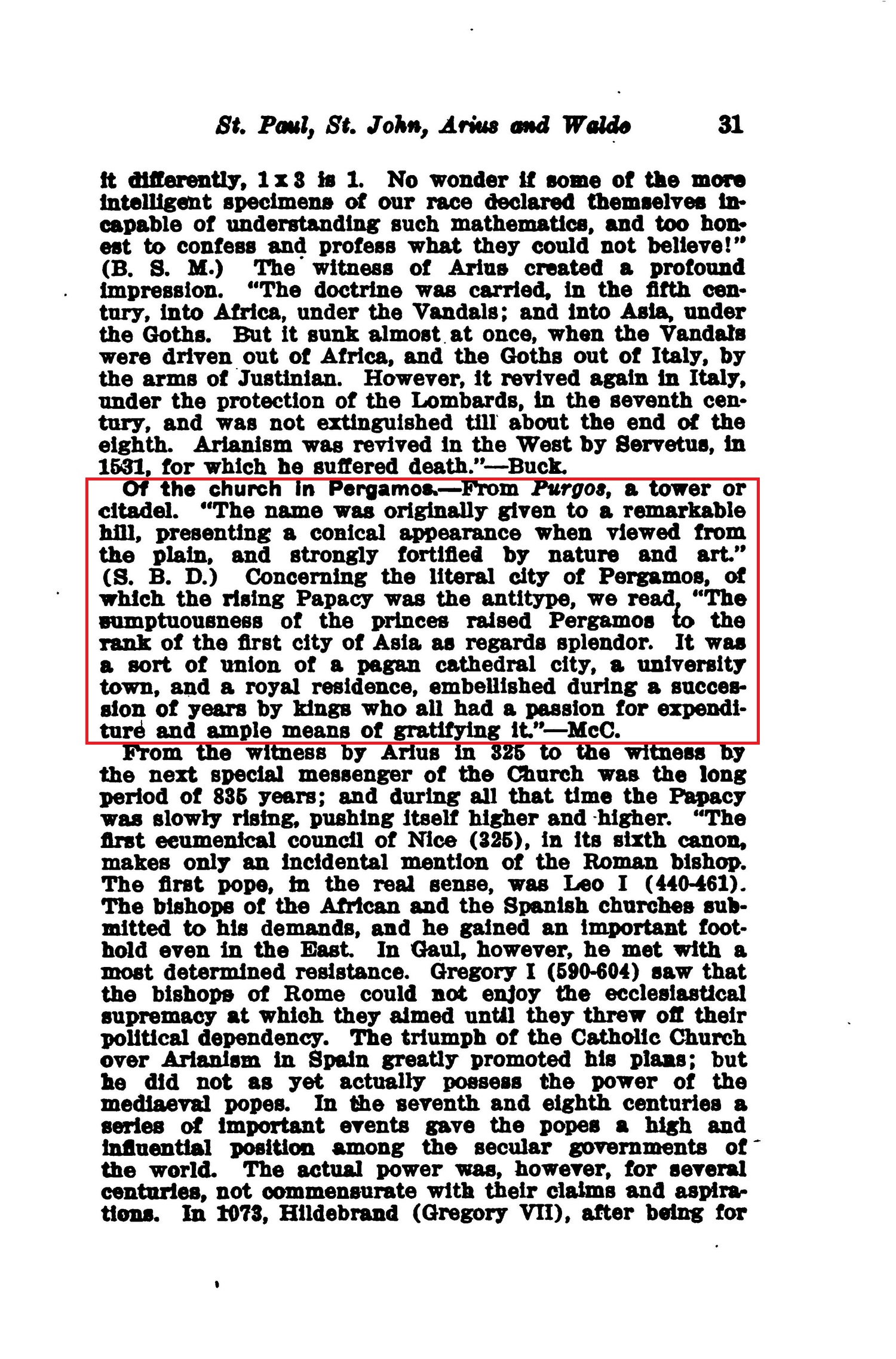 Of the church In Pergamo.—From Purgos, a tower or citadel. "The name was originally given to a remarkable hill, presenting a conical appearance when viewed from the plain, and strongly fortified by nature and art" (8. B. D.) Concerning the literal city of Pergamos, of which the rising Papacy was the antitype, we read. "The sumptuousness of the princes raised Pergamos to the rank of the first city of Asia as regards splendor. It was a sort of union of a pagan cathedral city, a university town, and a royal residence, embellished during a succession of years by kings who all had a passion for expenditure and ample means of gratifying it"—McC. Source : 🇺🇸 1917-1923 - Studies in the Scriptures, Vol 7, The finished mystery, page 31 + Cover |