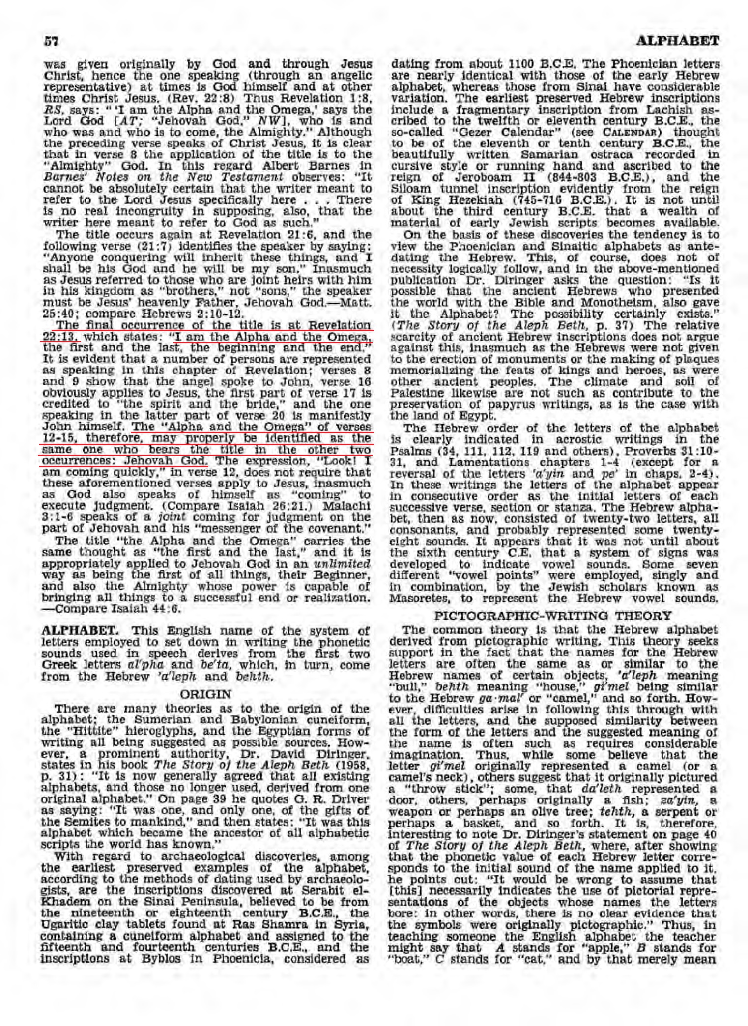 The title "the Alpha and the Omega" carries the same thought as "the first and the last," and it is appropriately applied to Jehovah God in an unlimited way as being the first of all things, their Beginner, and also the Almighty whose power is capable of bringing all things to a successful end or realization . - Compare Isaiah 44:6. Source : 🇺🇸 1971 - Aid to Bible understanding, page 57 + Cover |