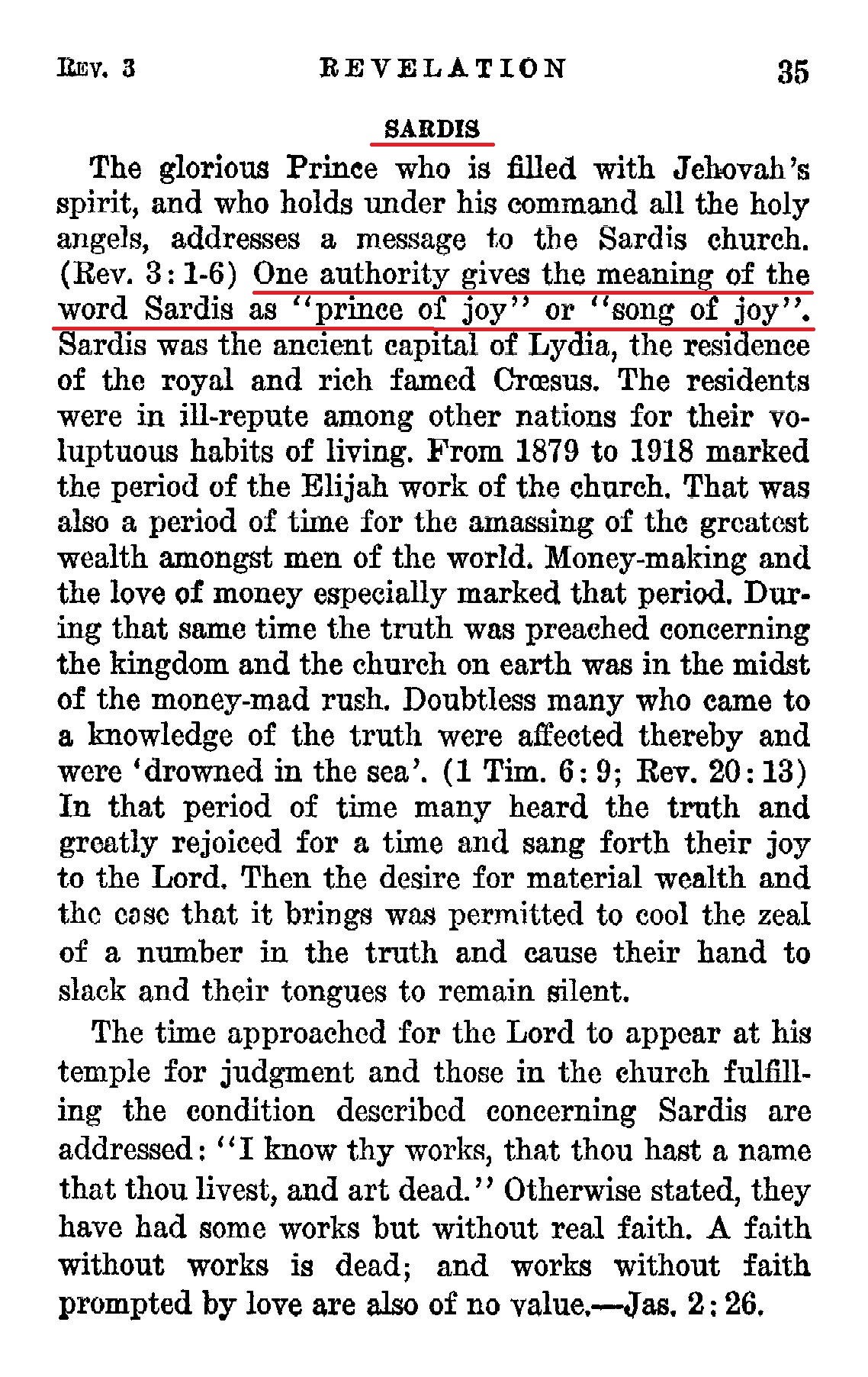 (Rev. 3:1-6) One authority gives the meaning of the word Sardis as "prince of joy" or "song of joy". Sardis was the ancient capital of Lydia, the residence of the royal and rich famed Croesus. Source : 🇺🇸 1930 - Light, vol 1, page 35 + Cover |