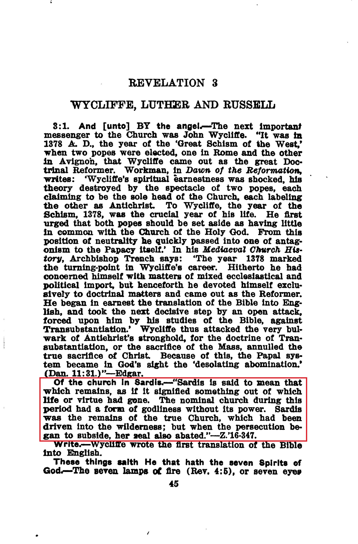 Of the church In Sardie.—"Sardis is said to mean that which remains, as if it signified something out of which life or virtue had gone. The nominal church during this period had a form of godliness without its power. Sardis was the remains of the true Church, which had been driven into the wilderness; but when the persecution began to subside, her seal also abated." — Z.'16-347. Source : 🇺🇸 1917- Studies in the Scriptures, Vol 7, The finished mystery, page 45 + Cover |