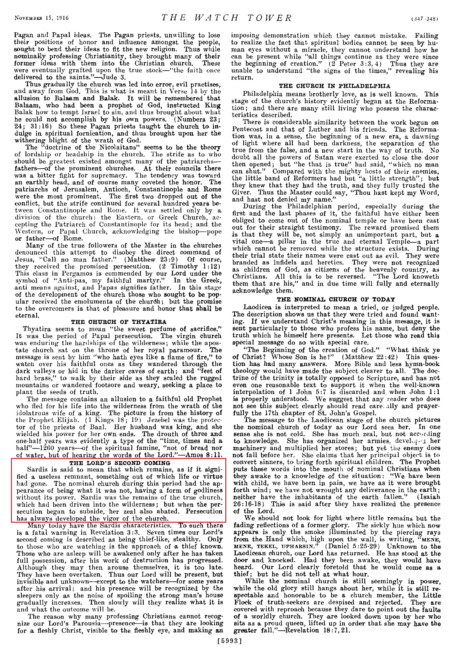 Sardis is said to mean that which remains, as if it signified a useless remnant, something out of which life or virtue had gone. The nominal church during this period had the appearance of being what it was not, having a form of godliness without its power. Sardis was the remains of the true church, which had been driven into the wilderness; but when the persecution began to subside, her zeal also abated. Persecution has always developed the vigor of the church. Source : 🇺🇸 The Watch Tower, November 15 1916, page 347 |