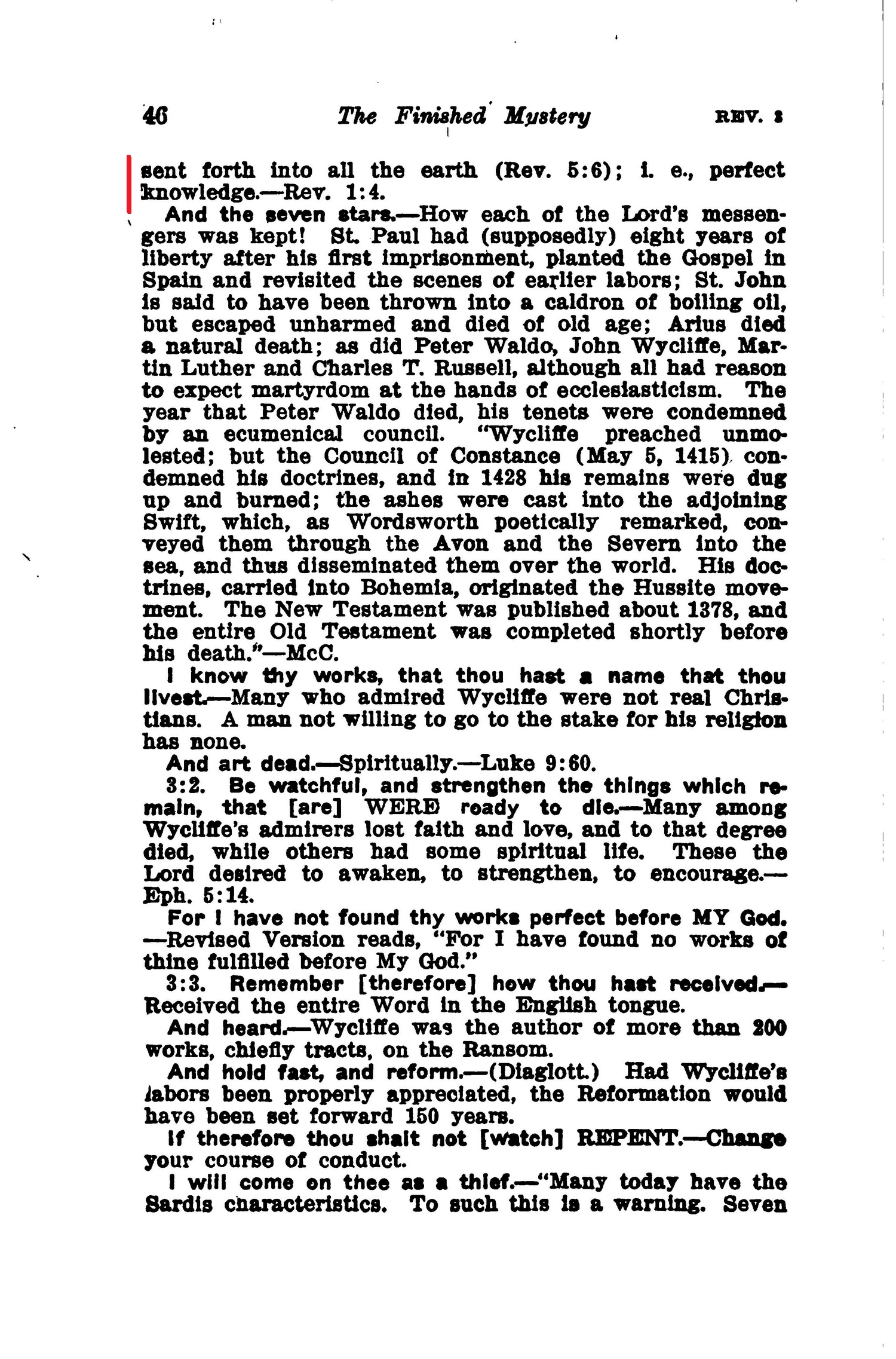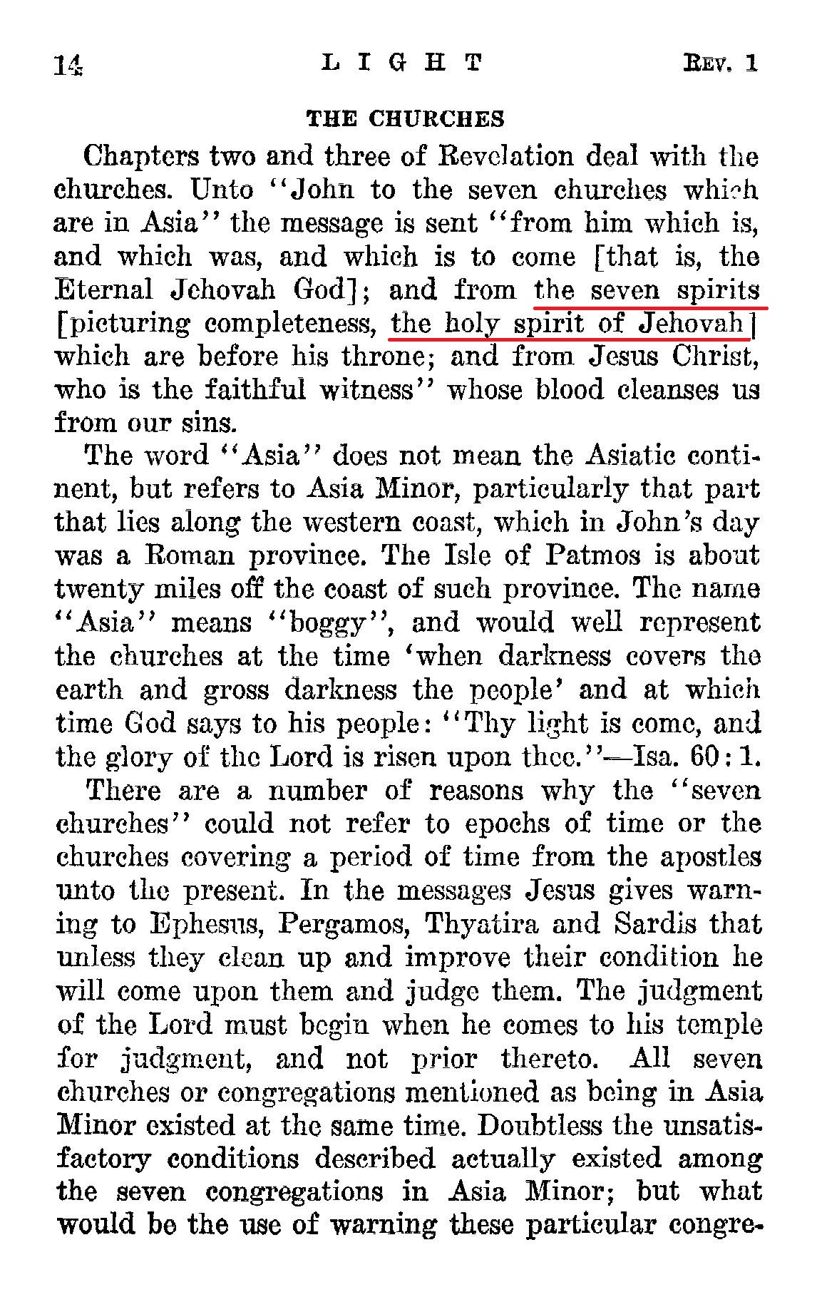 Chapters two and three of Revelation deal with the churches. Unto "John to the seven churches which are in Asia" the message is sent "from him which is, and which was, and which is to come [that is, the Eternal Jehovah God]; and from the seven spirits [picturing completeness, the holy spirit of Jehovah] which are before his throne; and from Jesus Christ, who is the faithful witness" whose blood cleanses us from our sins. Source : 🇺🇸 1930 - Light, vol 1, page 14 + Cover |