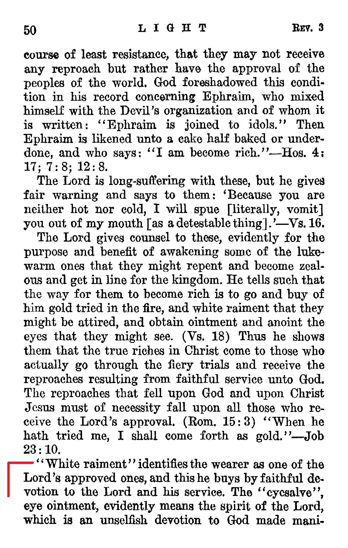 "White raiment" identifies the wearer as one of the Lord's approved ones, and this he buys by faithful devotion to the Lord and his service. Source : 🇺🇸 1930 - Light, vol 1, page 50 + Cover |