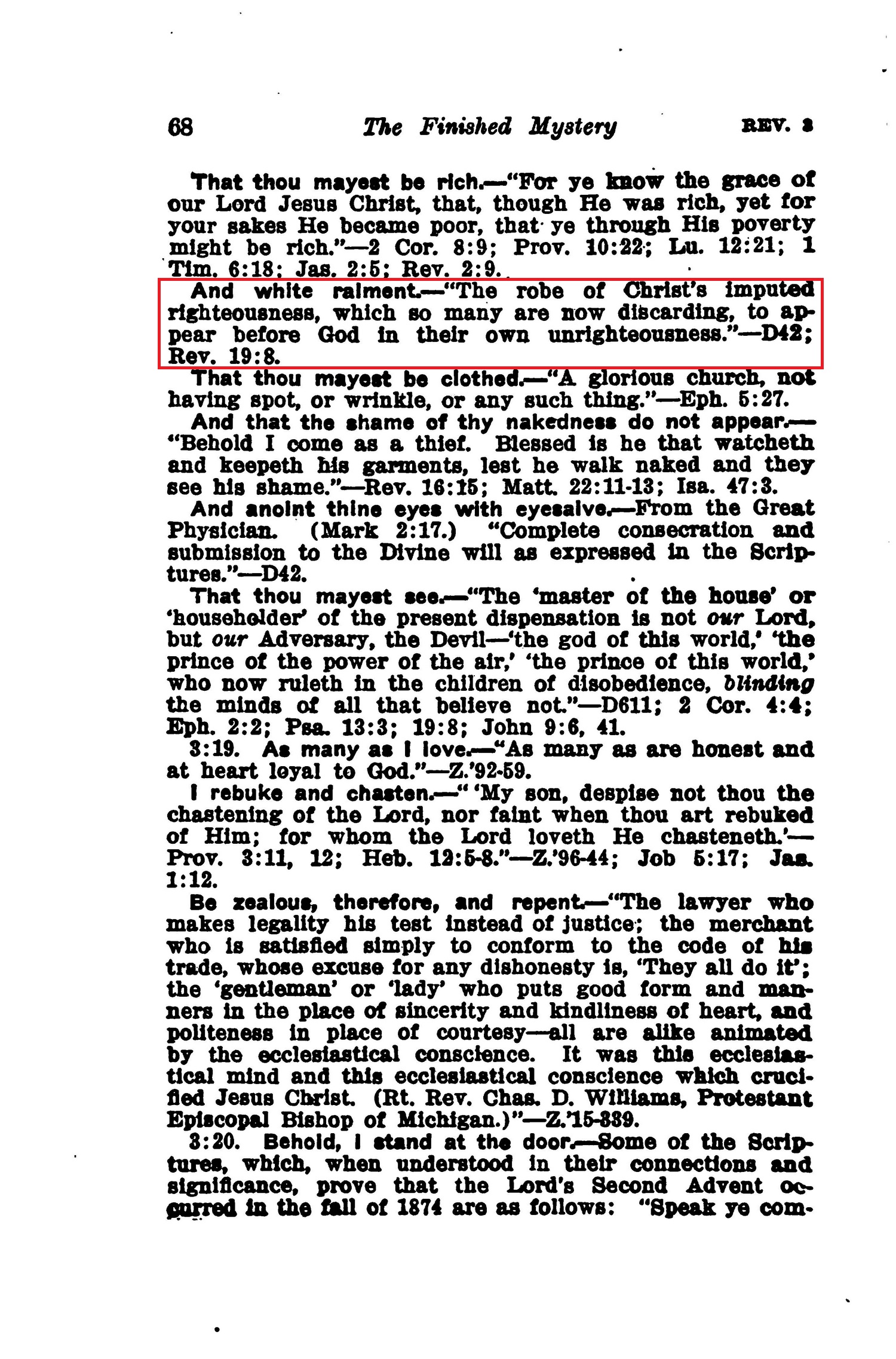 And white raiment.—"The robe of Christ's Imputed righteousness, which so many are now discarding, to appear before God In their own unrighteousness."—D42; Rev. 19:8. Source : 🇺🇸 1917- Studies in the Scriptures, Vol 7, The finished mystery, page 68 + Cover |