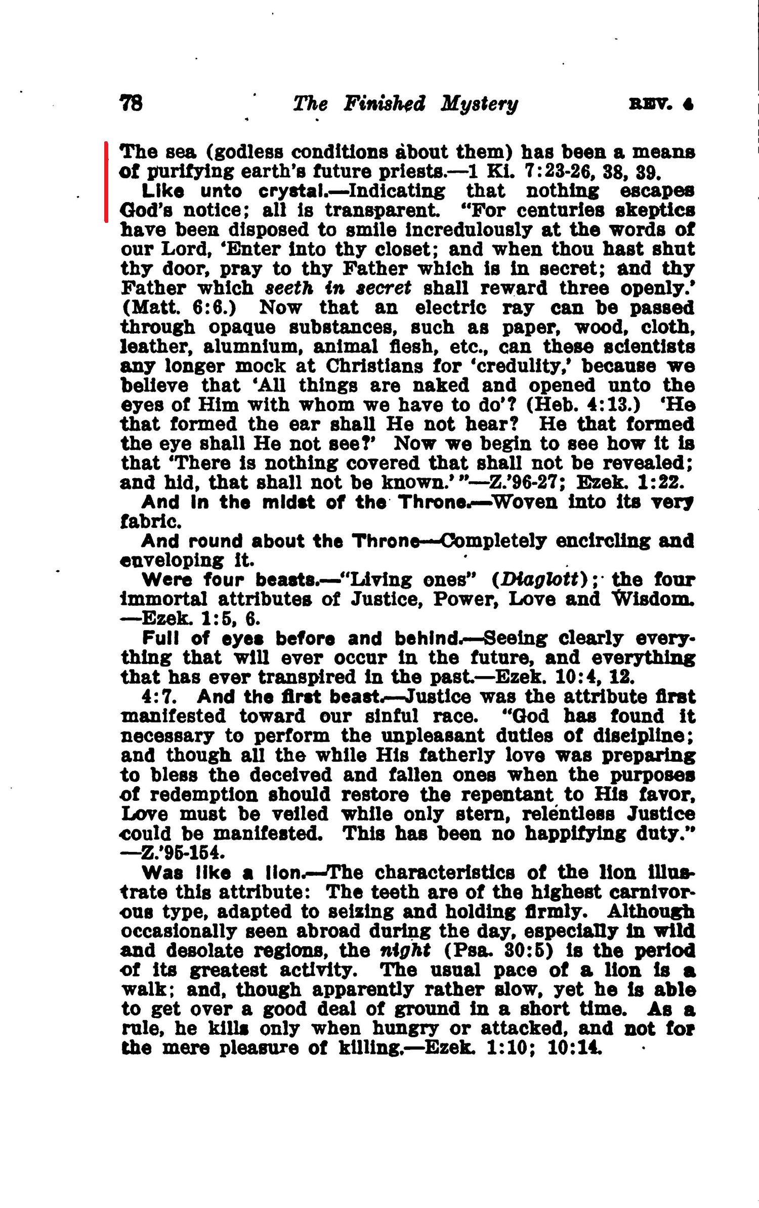 There was AS a sea of glass. —"The troubled surface which Daniel and Isaiah beheld (Dan. 7:2, 3; Isa. 57:20) became when seen before the Throne of God, calm and clear; reflecting as from a mirror, every fulfilment of the Divine purposes." (Cook.) (Rev. 21:18, 21; Ex. 24:10;) The sea (godless conditions about them) has been a means of purifying earth's future priests.—1 Ki. 7:23-26, 38, 39. Like unto crystal. — Indicating that nothing escapes God's notice; all is transparent. Source : 🇺🇸 1917- Studies in the Scriptures, Vol 7, The finished mystery, page 77, page 78 + Cover |