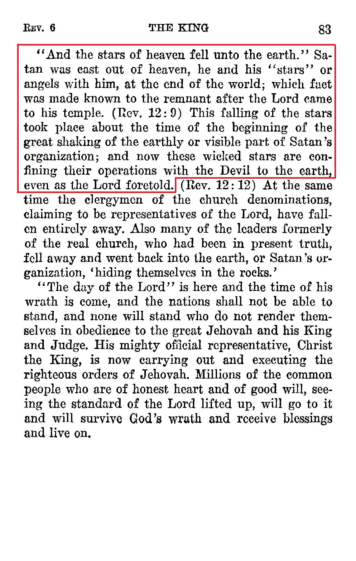 "And the stars of heaven fell unto the earth." Satan was cast out of heaven, he and his "stars" or angels with him, at the end of the world; which fact was made known to the remnant after the Lord came to his temple. (nov. 12: 9) This falling of the stars took place about the time of the beginning of the great shaking of the earthly or visible part of Satan's organization; and now these wicked stars are confining their operations with the Devil to the earth, even as the Lord foretold. Source : 🇺🇸 1930 - Light, vol 1, page 83 + Cover |