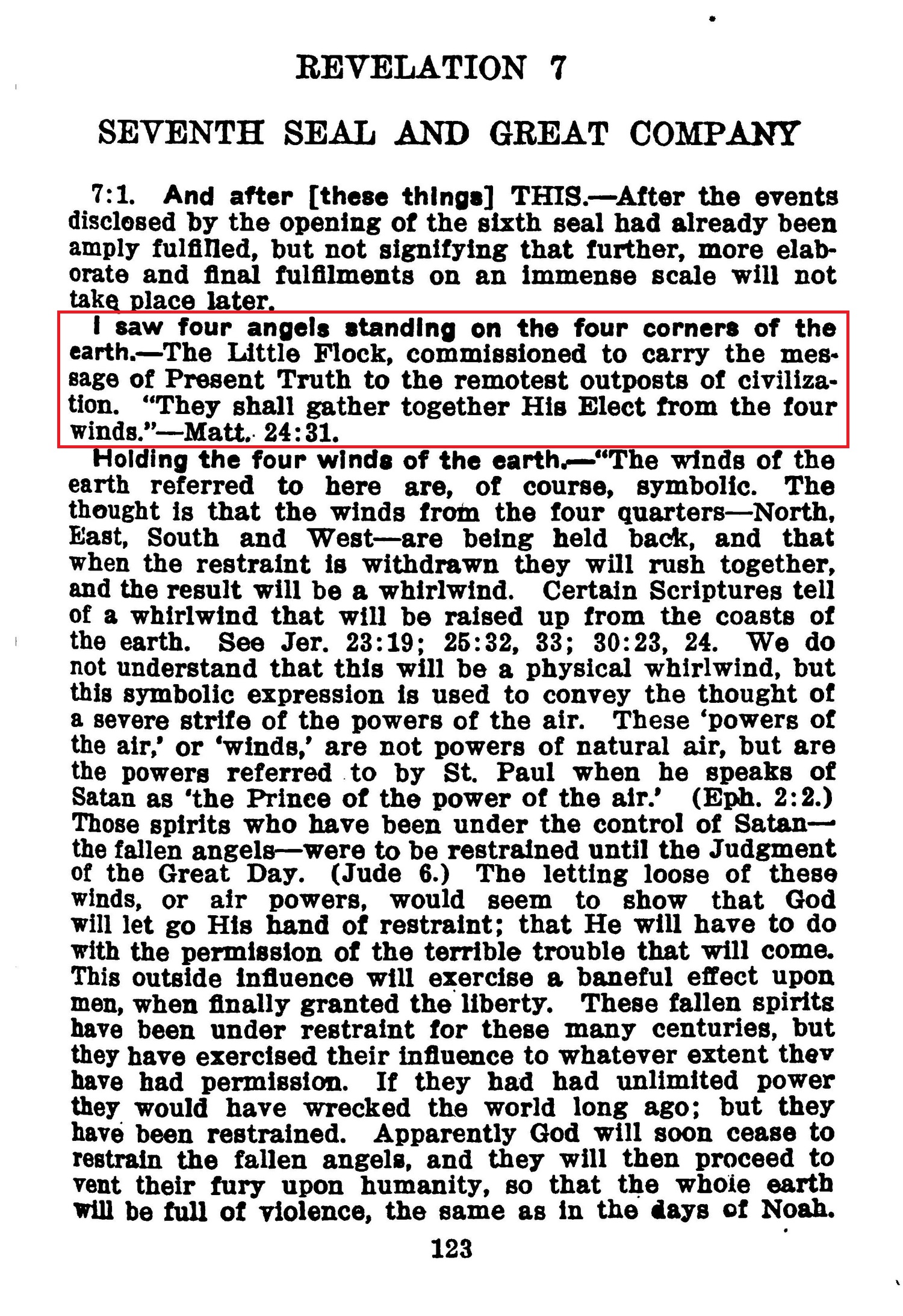 I saw four angels standing on the four corners of the earth.—The Little Flock, commissioned to carry the message of Present Truth to the remotest outposts of civilization. "They shall gather together His Elect from the four winds."—Matt 24:31. Source : 🇺🇸 1917 - Studies in the Scriptures, Vol 7, The finished mystery, page 123 + Cover |