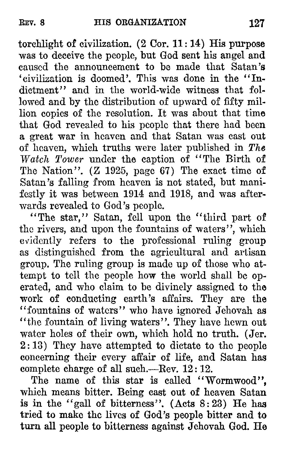 "The star," Satan, fell upon the "third part of the rivers, and upon the fountains of waters", which evidently refers to the professional ruling group as distinguished from the agricultural and artisan group. [...] They are the "fountains of waters" who have ignored Jehovah as "the fountain of living waters". [...] They have attempted to dictate to the people concerning their every affair of life, and Satan has complete charge of all such.-Rev. 12:12.