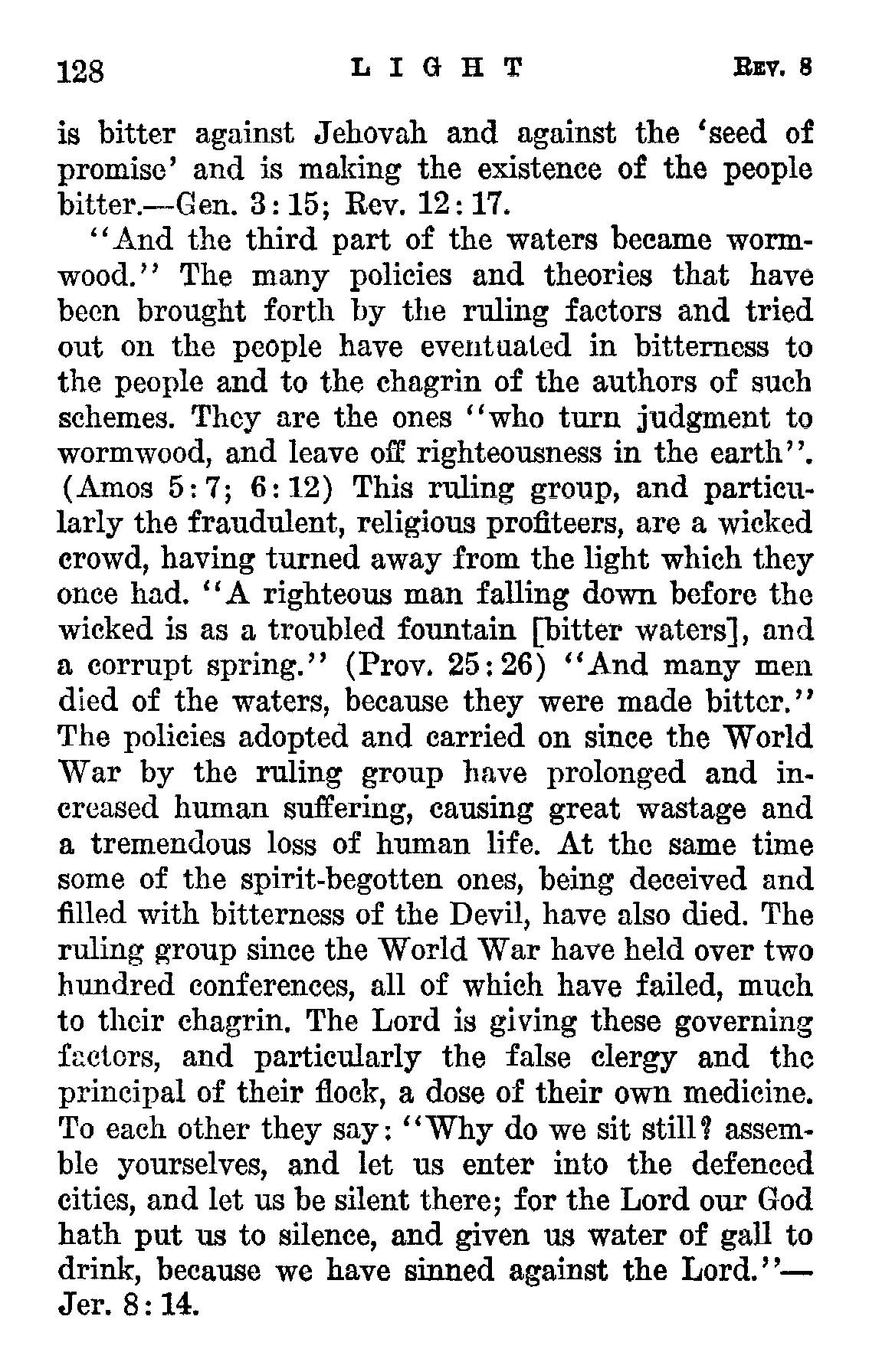 "And the third part of the waters became wormwood." The many policies and theories that have been brought forth by the ruling factors and tried out on the people have eventuated in bitterness to the people and to the chagrin of the authors of such schemes. They are the ones "who turn judgment to wormwood, and leave off righteousness in the earth". (Amos 5: 7; 6:12) This ruling group, and particularly the fraudulent, religious profiteers, are a wicked crowd, having turned away from the light which they once had. "A righteous man falling down before the wicked is as a troubled fountain [bitter waters], and a corrupt spring." (Prov. 25:26) Source : 🇺🇸 1930 - Light, vol 1, page 127, page 128 + Cover |
