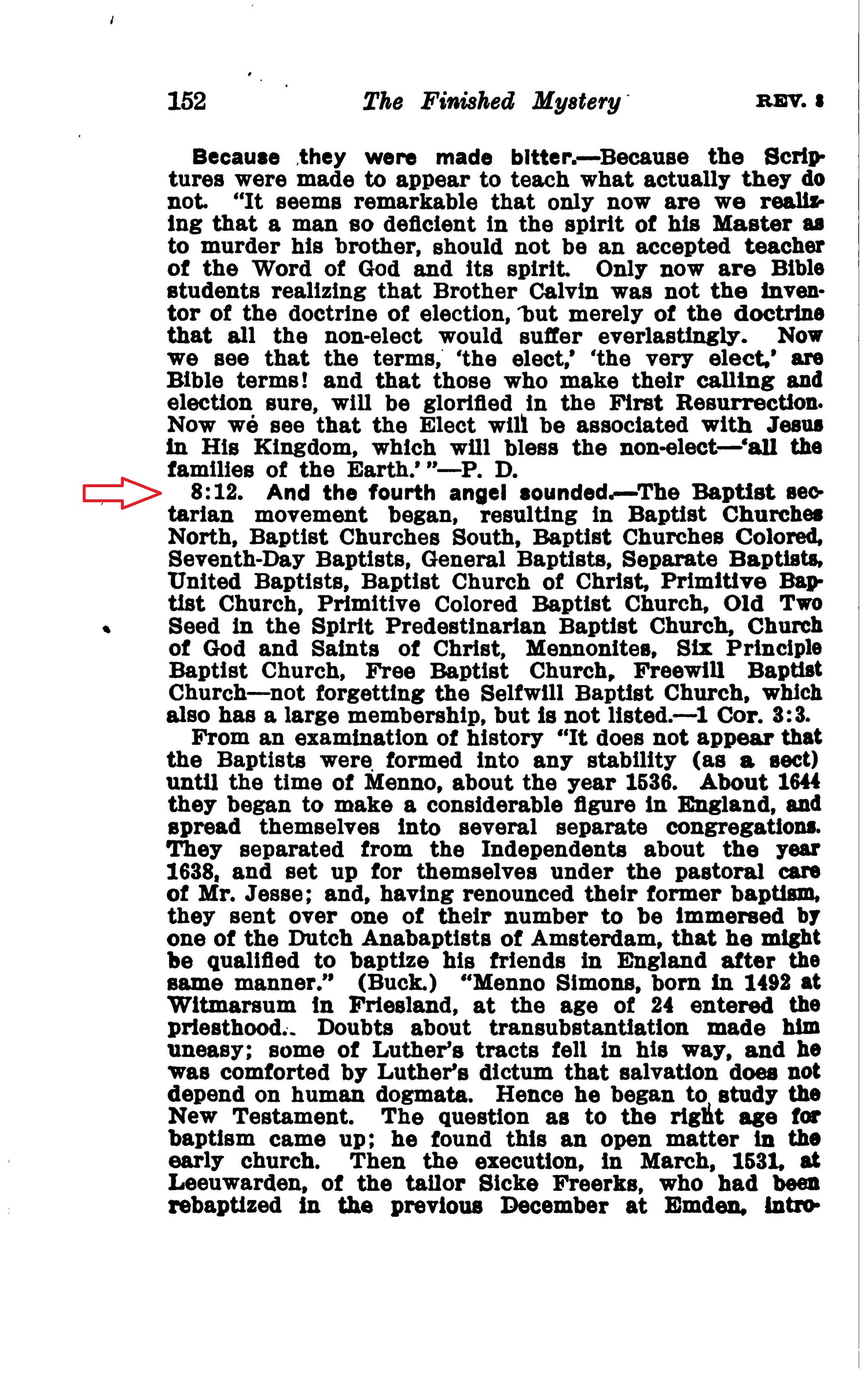 8:12. And the fourth angel sounded. - The Baptist sectarian movement began, resulting In Baptist Churches North, Baptist Churches South, Baptist Churches Colored, Seventh-Day Baptists, General Baptists, Separate Baptists, United Baptists, Baptist Church of Christ, Primitive Baptist Church, Primitive Colored Baptist Church, Old Two Seed In the Spirit Predestinarian Baptist Church, Church of Ood and Saints of Christ, Mennonltes, Six Principle Baptist Church, Free Baptist Church, Freewill Baptist Church—not forgetting the Selfwlll Baptist Church, which also has a large membership, but Is not listed.—1 Cor. 3:3. Source : 🇺🇸 1917 - Studies in the Scriptures, Vol 7, The finished mystery, page 152 + Cover |
