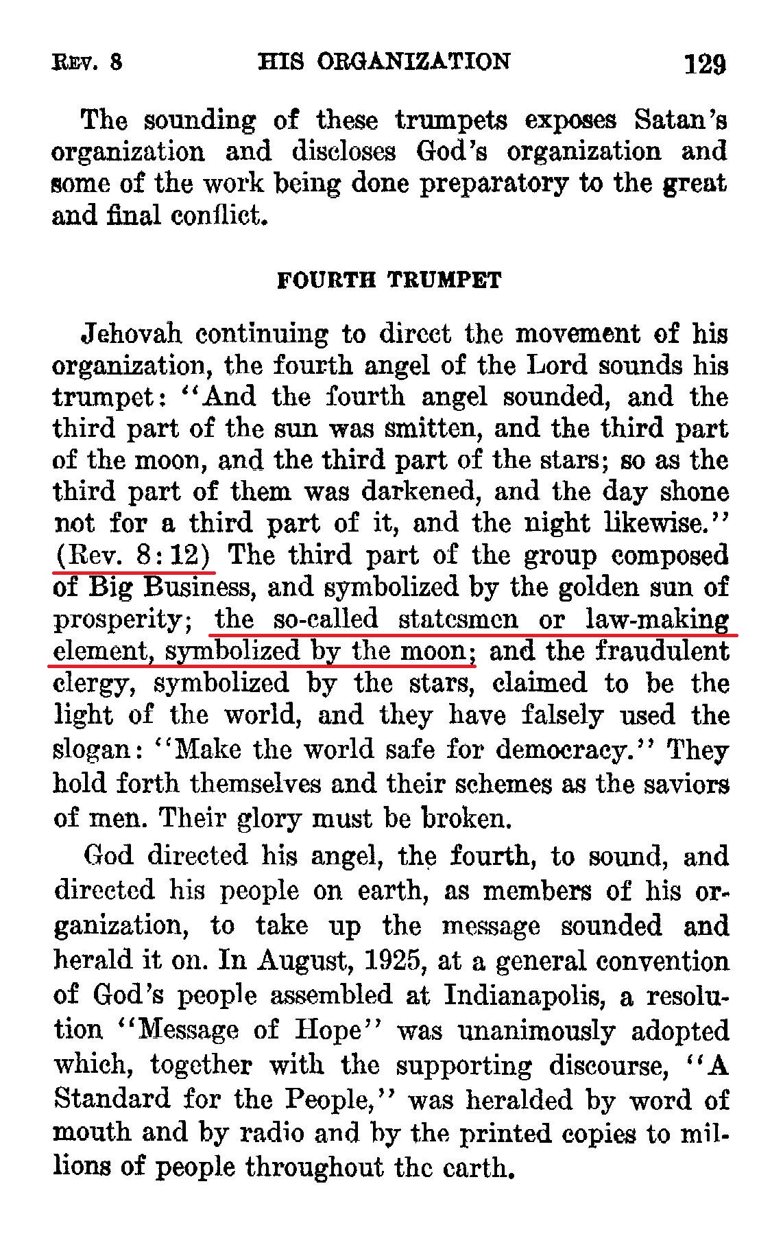 [...] "And the fourth angel sounded, and the third part of the sun was smitten, and the third part of the moon, and the third part of the stars; so as the third part of them was darkened, and the day shone not for a third part of it, and the night likewise." (Rev. 8: 12) The third part of the group composed of Big Business, and symbolized by the golden sun of prosperity; the so-called statesmen or law-making element, symbolized by the moon; and the fraudulent clergy, symbolized by the stars, claimed to be the light of the world, and they have falsely used the slogan: "Make the world safe for democracy." Source : 🇺🇸 1930 - Light, vol 1, page 129 + Cover |