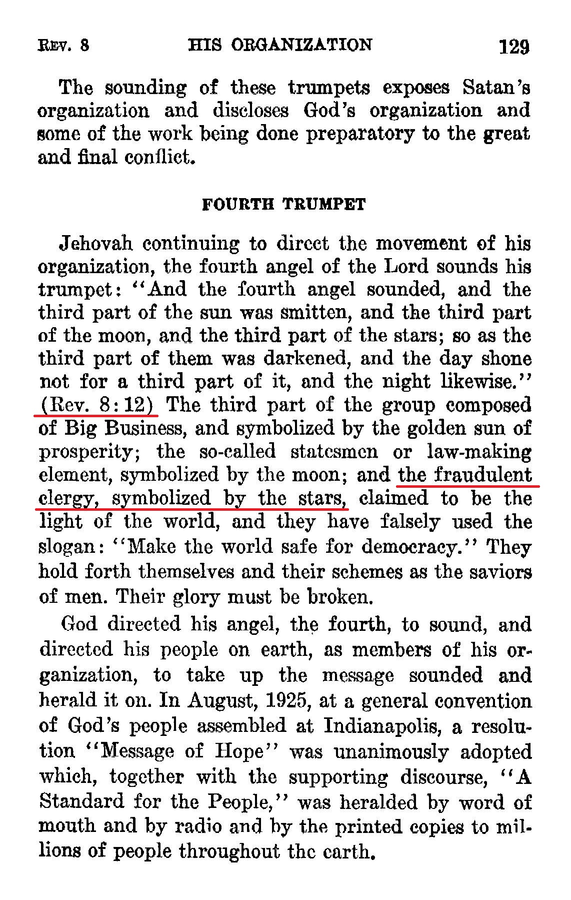 [...] "And the fourth angel sounded, and the third part of the sun was smitten, and the third part of the moon, and the third part of the stars; so as the third part of them was darkened, and the day shone not for a third part of it, and the night likewise." (Rev. 8: 12) The third part of the group composed of Big Business, and symbolized by the golden sun of prosperity; the so-called statesmen or law-making element, symbolized by the moon; and the fraudulent clergy, symbolized by the stars, claimed to be the light of the world, and they have falsely used the slogan: "Make the world safe for democracy." Source : 🇺🇸 1930 - Light, vol 1, page 129 + Cover |