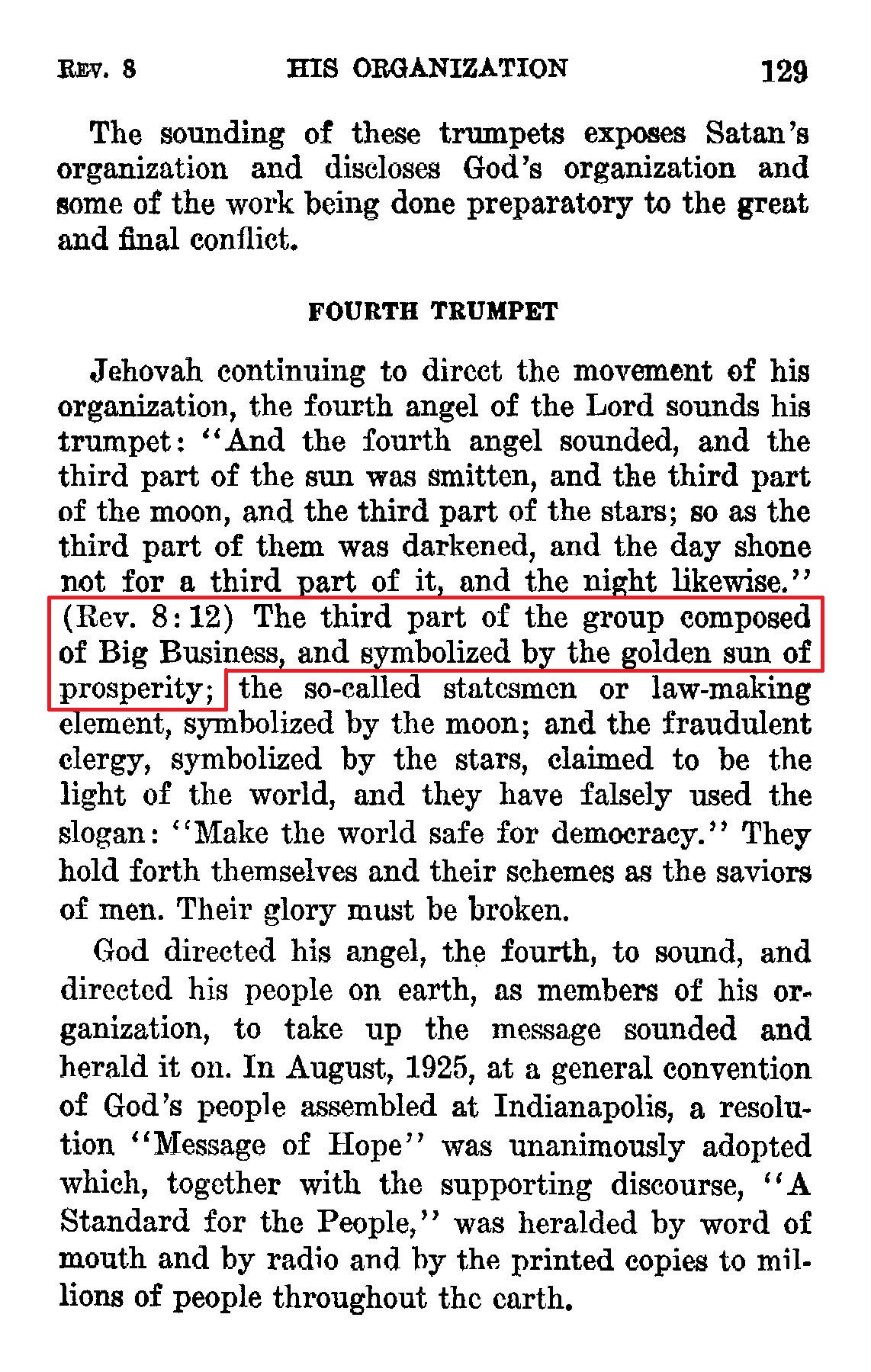 [...] "And the fourth angel sounded, and the third part of the sun was smitten, and the third part of the moon, and the third part of the stars; so as the third part of them was darkened, and the day shone not for a third part of it, and the night likewise." (Rev. 8: 12) The third part of the group composed of Big Business, and symbolized by the golden sun of prosperity; the so-called statesmen or law-making element, symbolized by the moon; and the fraudulent clergy, symbolized by the stars, claimed to be the light of the world, and they have falsely used the slogan: "Make the world safe for democracy." Source : 🇺🇸 1930 - Light, vol 1, page 129 + Cover |