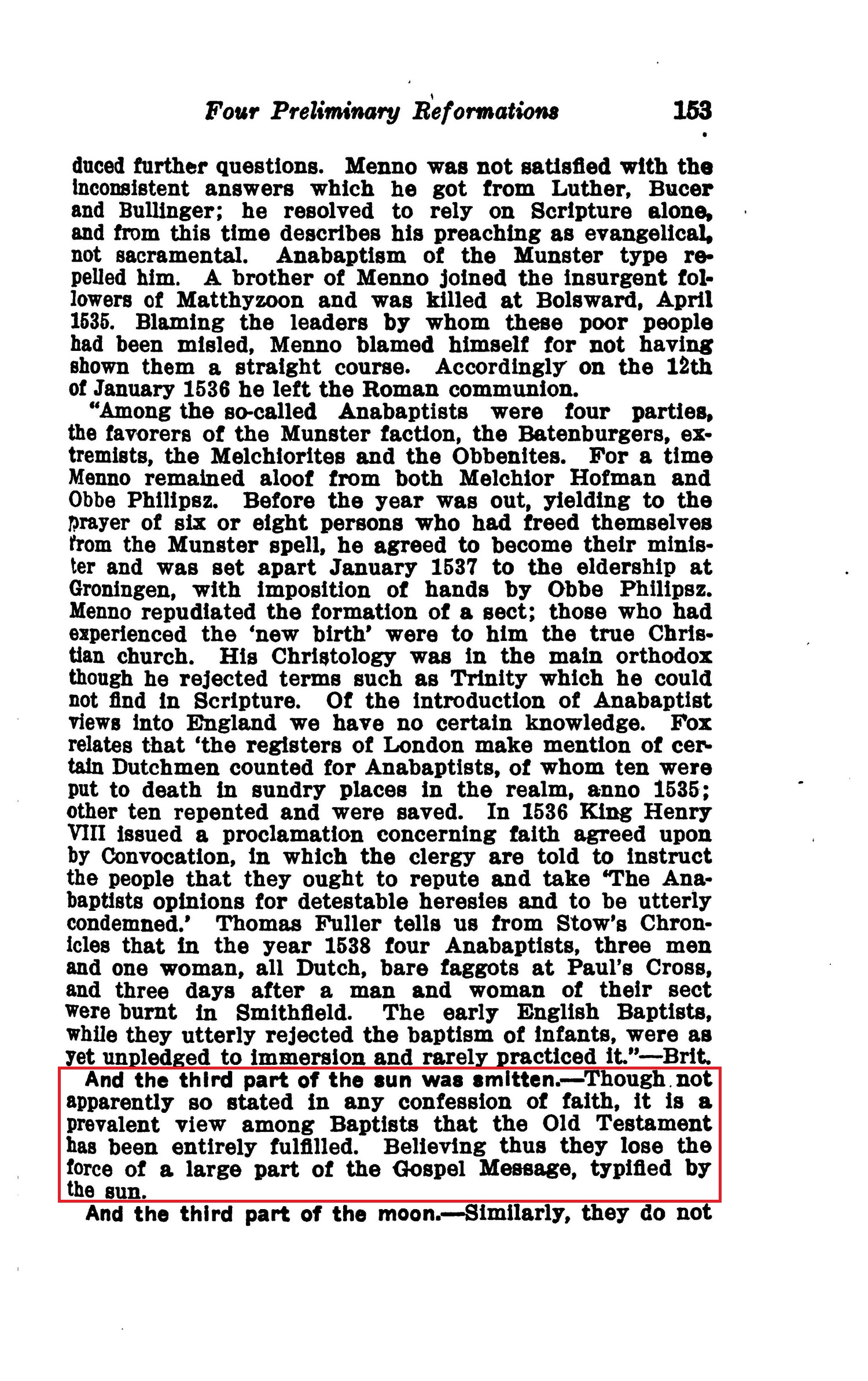 And the third part of the sun was smitten. — Though not apparently so stated in any confession of faith, It is a prevalent view among Baptists that the Old Testament has been entirely fulfilled. Believing thus they lose the force of a large part of the Gospel Message, typified by the sun. Source : 🇺🇸 1917 - Studies in the Scriptures, Vol 7, The finished mystery, page 153 + Cover |