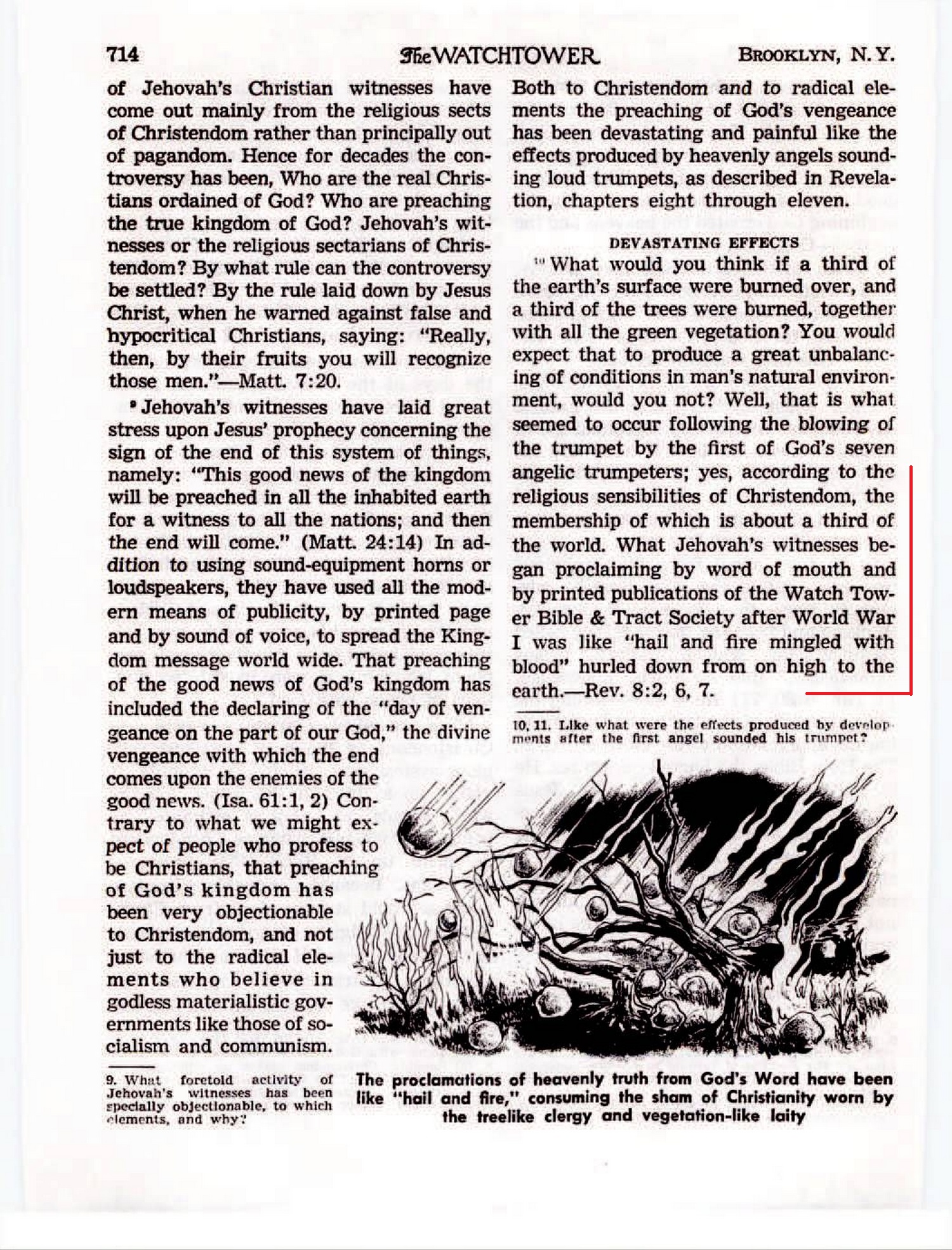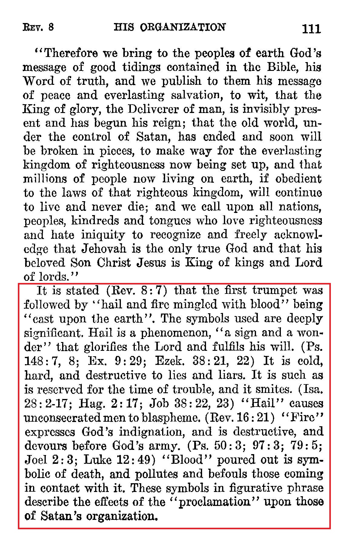 according to the religious sensibilities of Christendom, the membership of which is about a third of the world. What Jehovah’s witnesses began proclaiming by word of mouth and by printed publications of the Watch Tower Bible & Tract Society after World War I was like “hail and fire mingled with blood” hurled down from on high to the earth.—Rev. 8:2, 6, 7. [...] To the high ones, like “ trees,” and to the low ones, like the “green vegetation” or grass, the message preached was inflammatory and consuming, hard-hitting and death-dealing. The message preached contained the heavenly truth of God’s written Word, all right, but these truths were not like refreshing drops of rain. They were, rather, like hard cold hail that beat down upon both clergy and their church members, stunning them with Bible truth forcefully presented, unsparingly. They were fiery, consuming the sham of Christianity that the treelike clergy and the vegetation-like laity wore, burning them up as Christians, as it were, proving that Christendom was not Christian, either in doctrine or in practice. Source : 🇺🇸 The Watchtower, December 1 1969, page 714, page 715 + Cover |