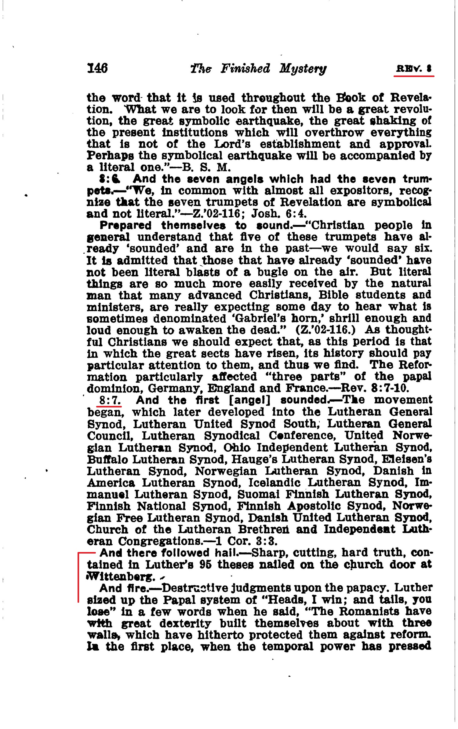 8:7. And the first [angel] sounded.—The movement began, [...] And there followed hail.—Sharp, cutting, hard truth, contained in Luther's 95 theses nailed on the church door at Wittenberg.