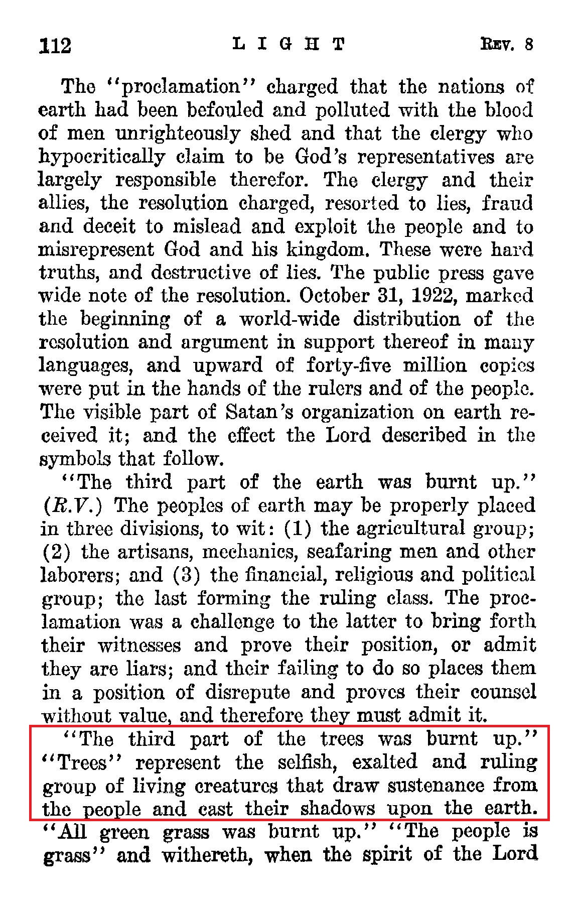 "The third part of the trees was burnt up." "Trees" represent the selfish, exalted and ruling group of living creatures that draw sustenance from the people and cast their shadows upon the earth. Source : 🇺🇸 1930 - Light, vol 1, page 112 + Cover |