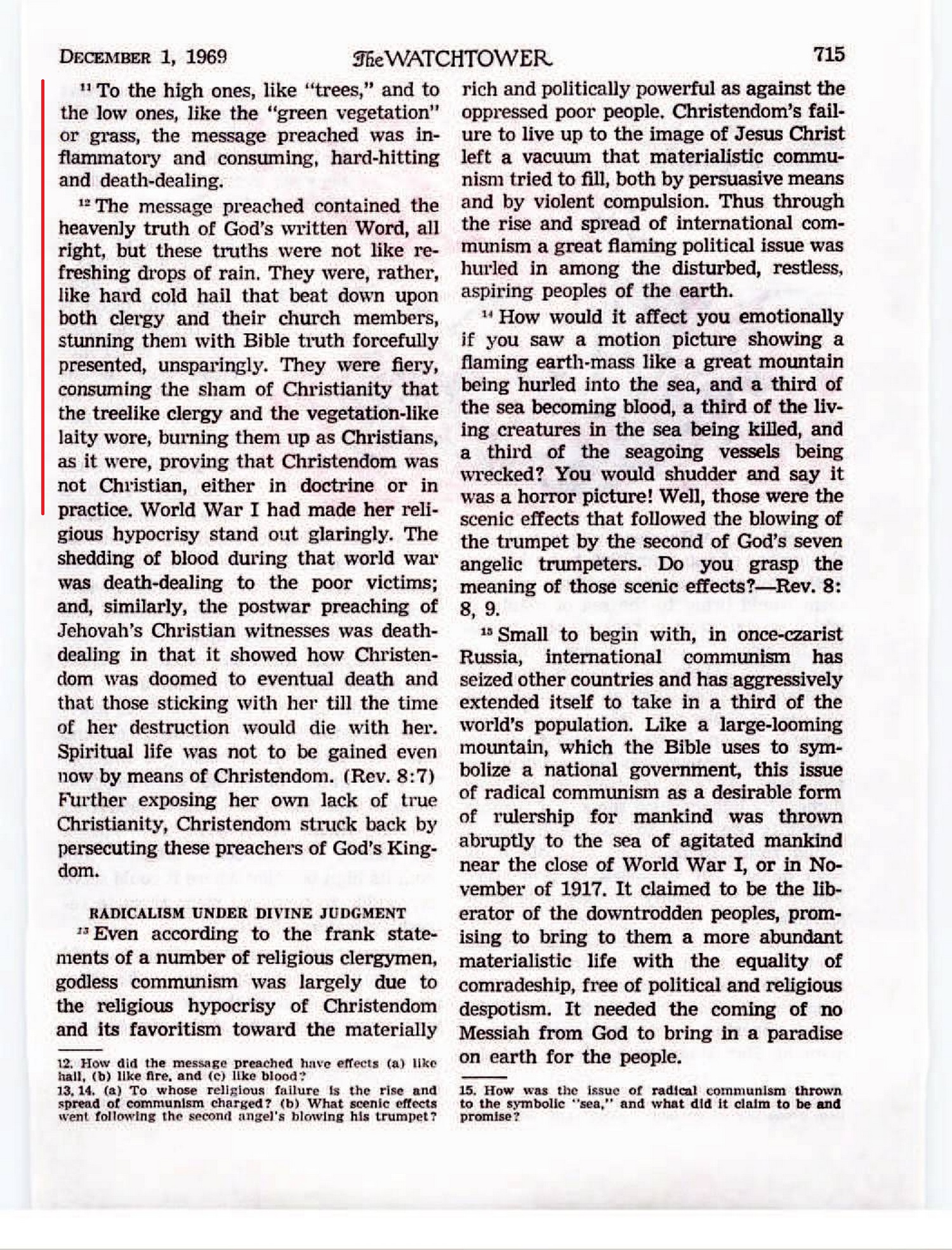 The message preached contained the heavenly truth of God’s written Word, all right, but these truths were not like refreshing drops of rain. They were, rather, like hard cold hail that beat down upon both clergy and their church members, stunning them with Bible truth forcefully presented, unsparingly. They were fiery, consuming the sham of Christianity that the treelike clergy and the vegetation-like laity wore, burning them up as Christians, as it were, proving that Christendom was not Christian, either in doctrine or in practice. Source : 🇺🇸 The Watchtower, December 1 1969, page 715 + Cover |