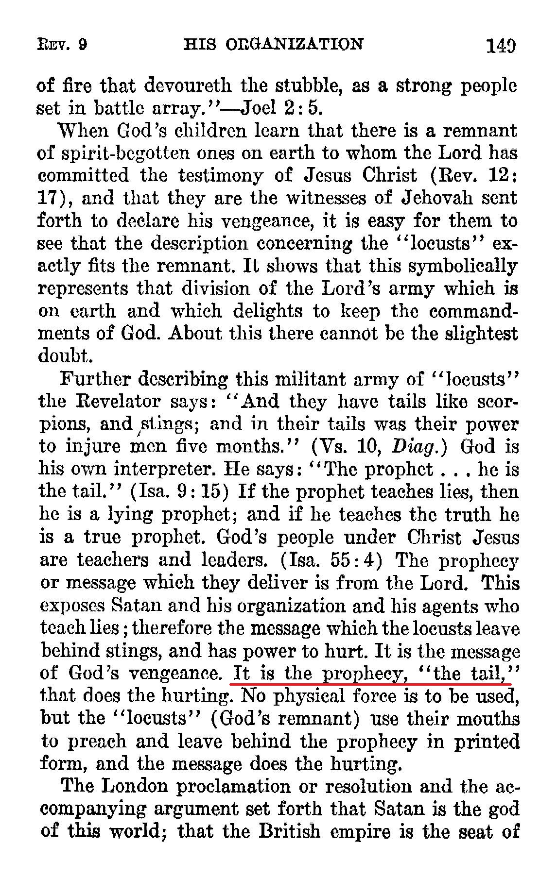 He says: "The prophet ... he is the tail." (Isa. 9:15) If the prophet teaches lies, then he is a lying prophet; and if he teaches the truth he is a true prophet. God's people under Christ Jesus are teachers and leaders. (Isa, 55:4) The prophecy or message which they deliver is from the Lord. This exposes Satan and his organization and his agents who teach lies; therefore the message which the locusts leave behind stings, and has power to hurt. It is the message of God's vengeance. It is the prophecy, "the tail," that does the hurting. Source : 🇺🇸 1930 - Light, Vol 1, page 149 + Cover |