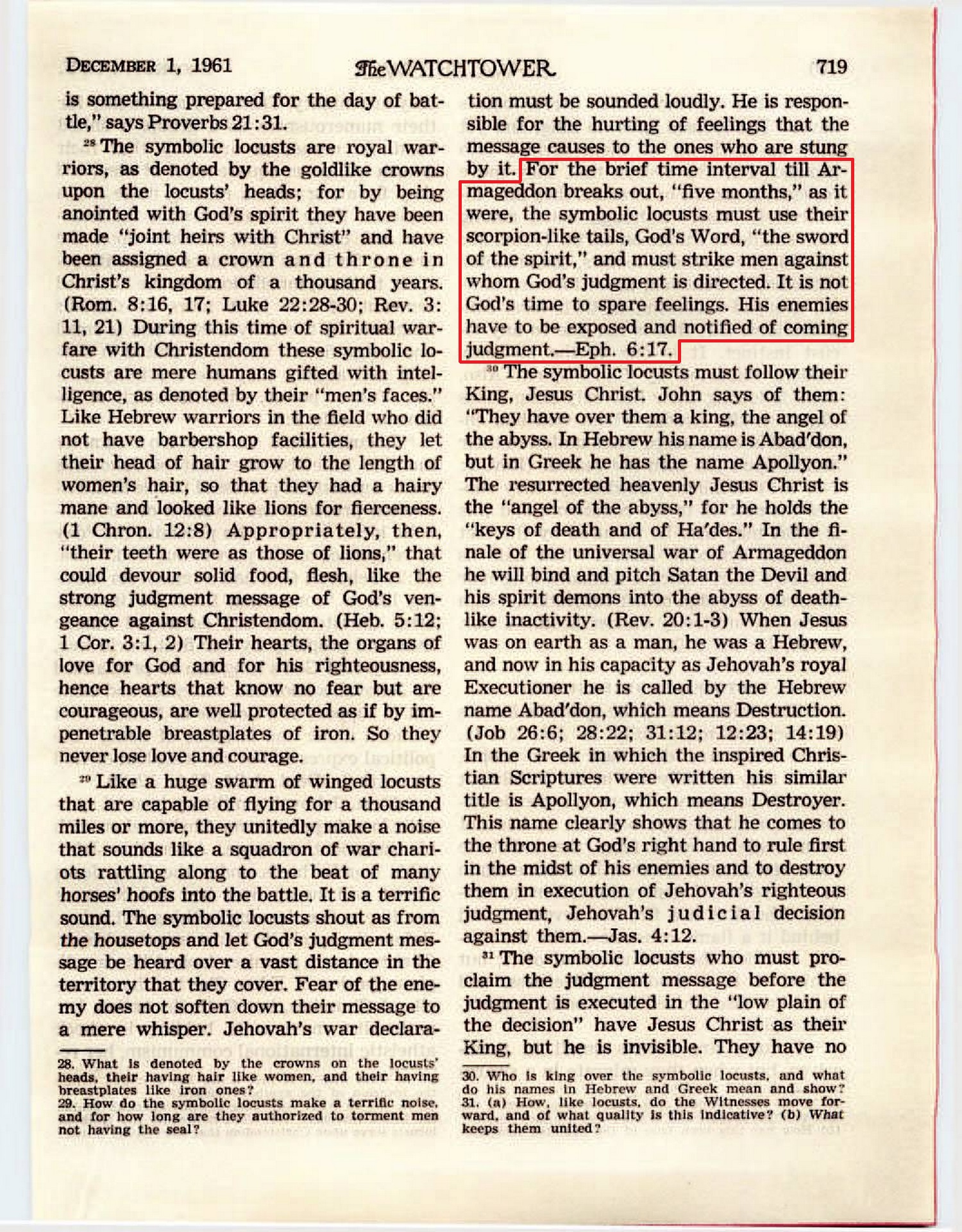 For the brief time interval till Armageddon breaks out, "five months," as it were, the symbolic locusts must use their scorpion-like tails, God's Word, "the sword of spirit," and must strike men against whom God's judgment is directed. It is not God's time to spare feelings. His enemies have to be exposed and notified of coming judgment. - Eph. 6:17.