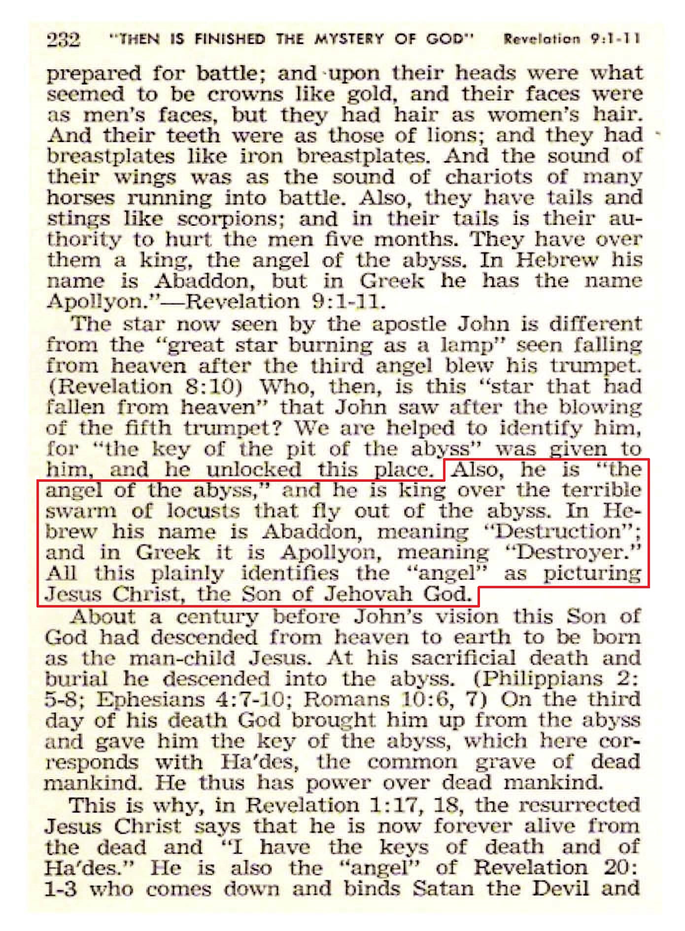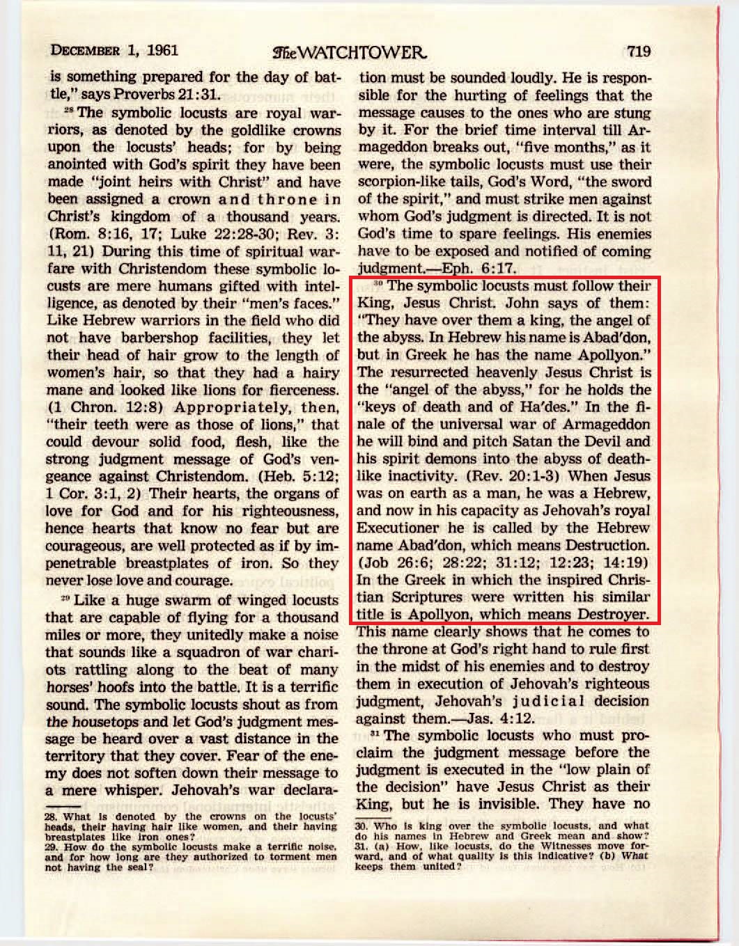 Verse eleven of this same ninth chapter of Revelation says concerning the locusts: "And they had a king over them, which is the angel of the bottomless pit, whose name in the Hebrew tongue is Abaddon, but in the Greek tongue hath his name Apollyon." [...] The word "Abaddon" is derived from the Hebrew term abad, and is applied to Jehovah, who is the One that is "able to save and to destroy". Jehovah destroys them that hate him. (Deut. 7:10) Many Scripture texts apply this Hebrew word to Jehovah relative to destruction. For example: "I will destroy thee, o covering cherub." (Ezek. 28:16) "Shall I not in that day [day of the Lord], saith the Lord, even destroy [Hebrew, abad] the wise men out of Edom, and understanding out of the mount of Esau [Satan's organization] '" (Obad. 8) To the same effect it is written: "And it shall come to pass in that day, saith the Lord, that I will cut off thy horses out of the midst 01 thee, and I will destroy thy chariots.' '-Mic. 5:10. The Greek word Apollyon, which the Revelator applies here, means "destroying one", and is applied many times in the Scriptures to Jehovah, who is called the destroying One. (Matt. 10:28; 21:41; Jude 5) If there could be any doubt about this, James settles it when he writes: "There is one lawgiver, who is able to save and to destroy [Greek, apollymi] : who art thou that judgest another ?" (Jas. 4:12) The overwhelming Scriptural authority, in both the Old and the New Testament, applies these titles to Jehovah. Christ Jesus being the chief executive officer of Jehovah, to whom is committed all power in heaven and earth, and being authorized to act as Jehovah's officer to destroy, the titles Abaddon and Apollyon therefore properly apply to him. (Num. 24:17-19; Mark 1: 24; Luke 4: 34) The only reasonable conclusion, therefore, is that Jesus, the glorified King armed for war and having the key to the bottomless pit, is the "king" over the "locusts". This definitely identifies the "locusts" as members of God's organization. The day of God's vengeance against the enemy organization having come, it is appropriate that Jehovah assume the role of Destroyer, that is, Abaddon, or Apollyon ("for our God is a consuming fire"), which title particularly applies at the time the kingdom is being announced. (Heb. 12:29) His beloved Son, then, the King, bears the same title, and the title has a special application in the "day of the Lord", which day began in 1914 and continues thereafter. Source : 🇺🇸 1930 - Light, Vol 1, page 145, page 146 + Cover |