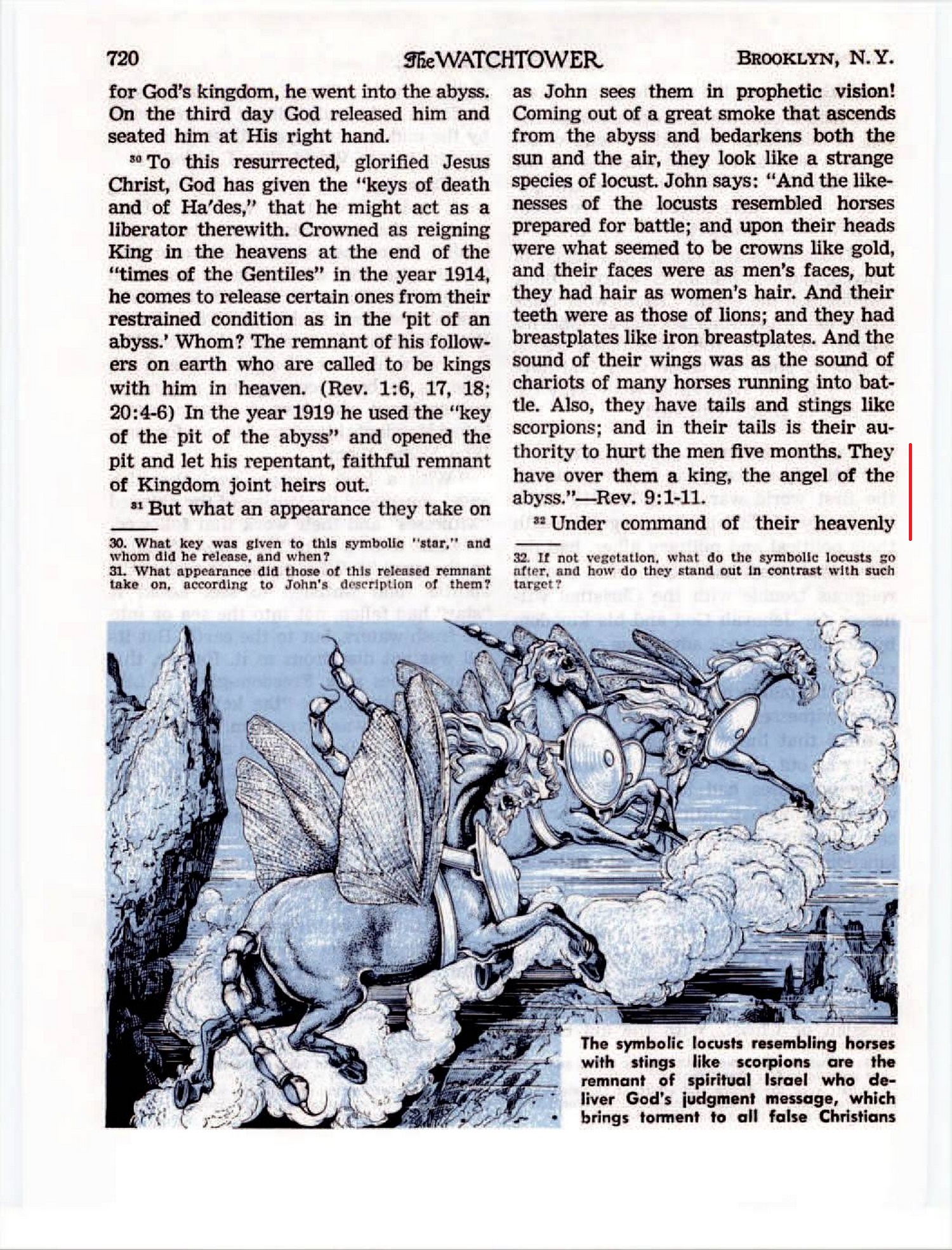 Under command of their heavenly King Jesus Christ, the remnant of anointed witnesses of Jehovah swarmed forth in 1919 from their abysmal condition of restraint [...] so these symbolic locusts are subject and submissive to their King, Jesus Christ, their Bridegroom to be. Source : 🇺🇸 The Watchtower, December 1 1969, page 720, page 721 + Cover |