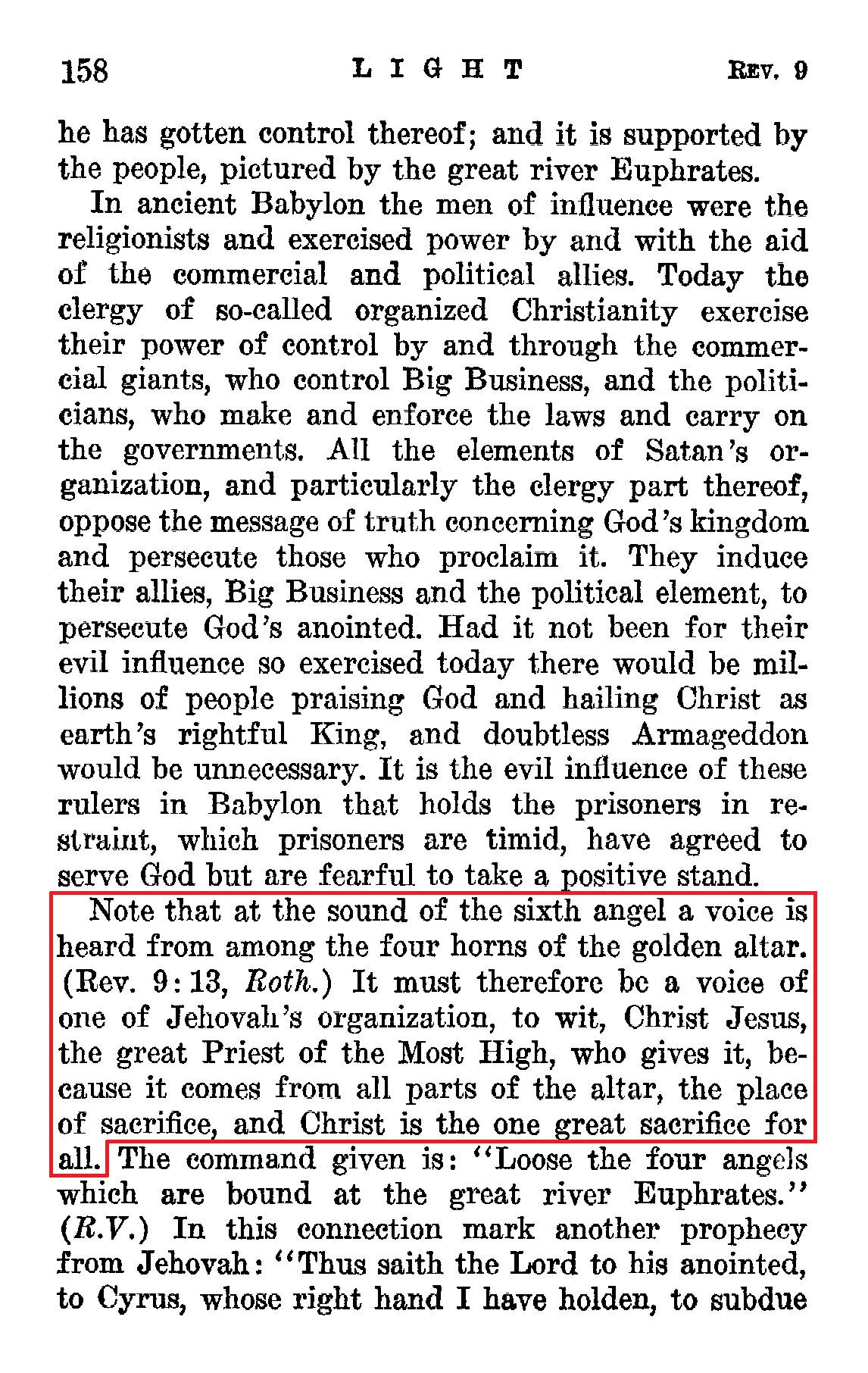 Note that at the sound of the sixth angel a voice is heard from among the four horns of the golden altar. (Rev. 9:13, Roth.) It must therefore be a voice of one of Jehovah's organization, to wit, Christ Jesus, the great Priest of the Most High, who gives it, because it comes from all parts of the altar, the place of sacrifice, and Christ is the one great sacrifice for all. Source : 🇺🇸 1930 - Light, Vol 1, page 158 + Cover |