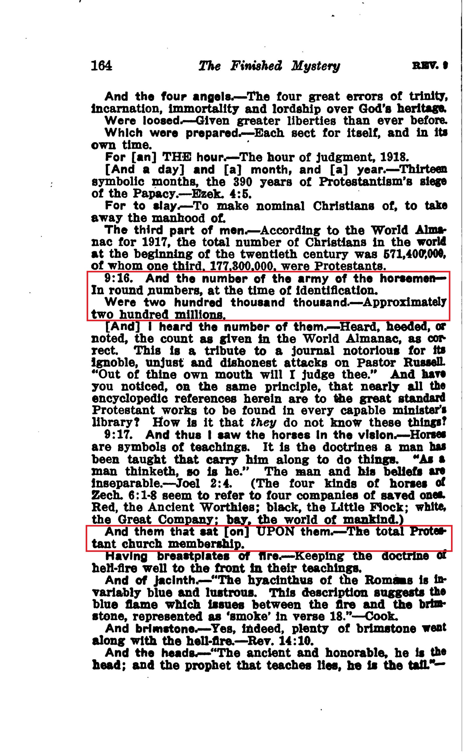 9:16. And the number of the army of the horsemen — In round numbers, at the time of identification. Were two hundred thousand thousand. — Approximately two hundred millions. 9:17. And thus I saw the horses In the vision. [...] And them that sat [on] UPON them. — The total Protestant church membership. Source : 🇺🇸 1917 - Studies in the Scriptures, Vol 7, The finished mystery, page 164 + Cover |